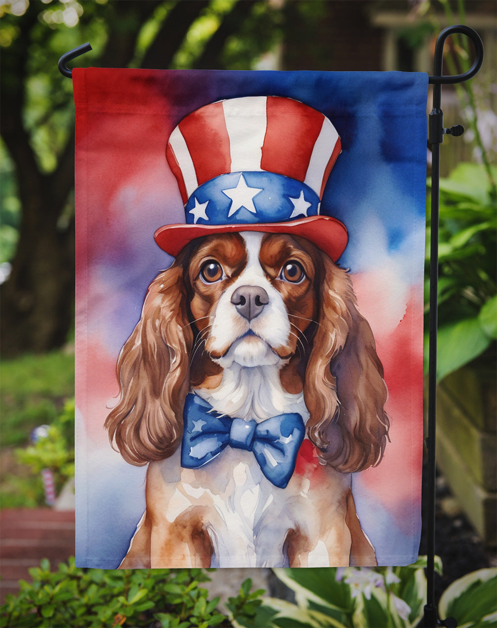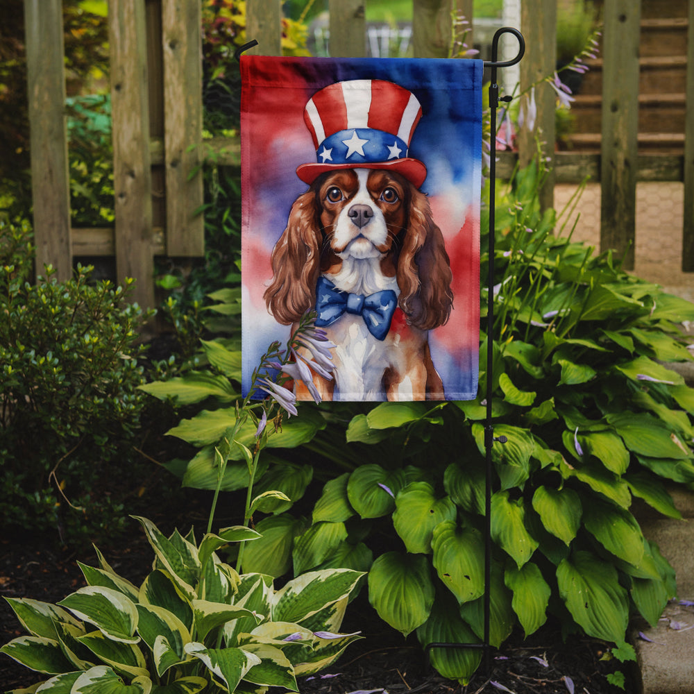 Garden Flag featuring breed specific Cavalier King Charles Spaniel artwork. Enhance the beauty of your garden, patio, or yard with Caroline's Treasures Decorative Garden Flag, proudly made in the USA. Crafted from two pieces of thick, double-sided polyester fabric, this 2-ply garden flag is designed to withstand various weather conditions, making it water-resistant and weatherproof. Featuring correctly readable words on both sides, this garden flag offers a delightful visual experience from any angle. With its heavier weight, it stands out among other garden flags, ensuring stability and durability even in wind, rain, and snow. Measuring approximately 11 1/4 inches by 15 1/2 inches, this flag allows you to personalize your outdoor decor. It comes with a 1 1/2-inch sleeve sewn in, allowing easy attachment to any standard garden flag stand or garden size porch hanger (sold separately). Make a statement in your outdoor space with Caroline's Treasures Decorative Garden Flag, a vibrant and high-quality flag that adds color and personality to your surroundings. Proudly made in the USA, it's a symbol of quality craftsmanship and attention to detail.