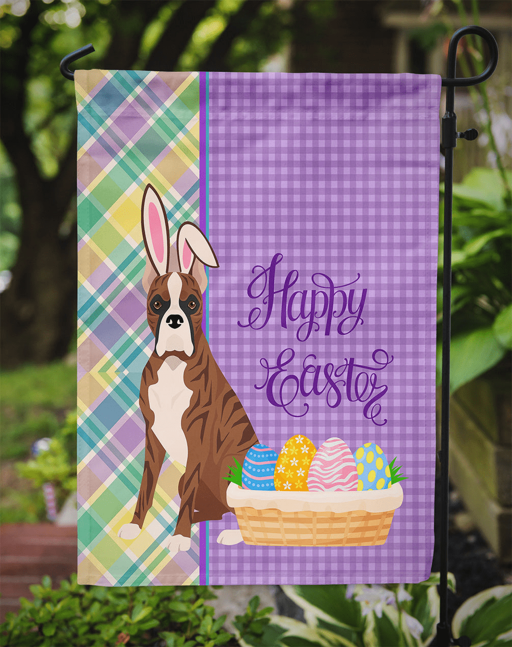 Garden Flag featuring breed specific Boxer artwork. Celebrate Easter with this Easter Garden Flag. This Garden Flag is from Caroline's Treasures collection Easter Egg Hunt. Enhance the beauty of your garden, patio, or yard with Caroline's Treasures Decorative Garden Flag, proudly made in the USA. Crafted from two pieces of thick, double-sided polyester fabric, this 2-ply garden flag is designed to withstand various weather conditions, making it water-resistant and weatherproof. Featuring correctly readable words on both sides, this garden flag offers a delightful visual experience from any angle. With its heavier weight, it stands out among other garden flags, ensuring stability and durability even in wind, rain, and snow. Measuring approximately 11 1/4 inches by 15 1/2 inches, this flag allows you to personalize your outdoor decor. It comes with a 1 1/2-inch sleeve sewn in, allowing easy attachment to any standard garden flag stand or garden size porch hanger (sold separately). Make a statement in your outdoor space with Caroline's Treasures Decorative Garden Flag, a vibrant and high-quality flag that adds color and personality to your surroundings. Proudly made in the USA, it's a symbol of quality craftsmanship and attention to detail. This Garden Flag is from Caroline's Treasures Dogs category of products.