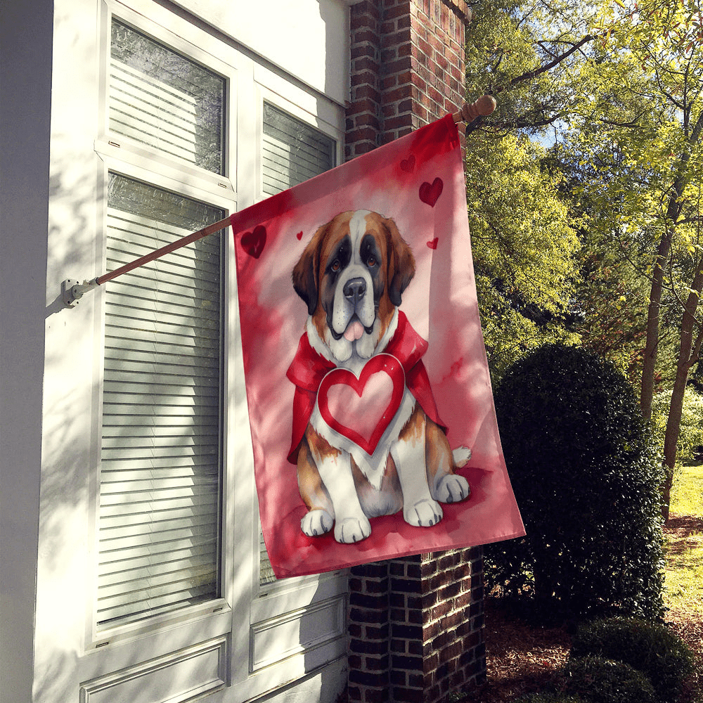 House Flag featuring breed specific Saint Bernard artwork. Celebrate Valentine's Day with this Valentine's Day Large Flag. Presenting our Heavy Duty Polyester House Size Decorative Sleeve Pole Flag, a vibrant addition to enhance the aesthetic appeal of your home. This large decorative flag, measuring approximately 28 x 40 inches, offers ample coverage and visibility. Each flag is meticulously sewn and made individually, ensuring a unique piece that may slightly vary in size. It's a sleeve pole flag, designed to fit a standard decorative flag pole effortlessly. Please note that the flag pole and bracket are not included and should be purchased separately. What sets our flag apart is its dual-sided print. The design is mirrored on both sides of the fabric, allowing for uniform visibility regardless of the angle. Printed in full color, our flag showcases vibrant hues that truly stand out. To ensure lasting vibrancy and durability, the dyes are heat-set into the fabric. This ensures your flag remains bright and captivating through various weather conditions. Elevate the look of your home with our Heavy Duty Polyester House Size Decorative Sleeve Pole Flag!