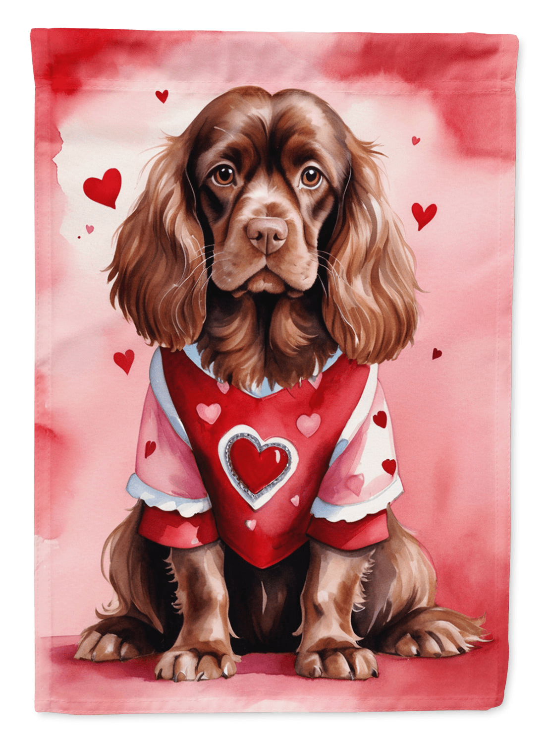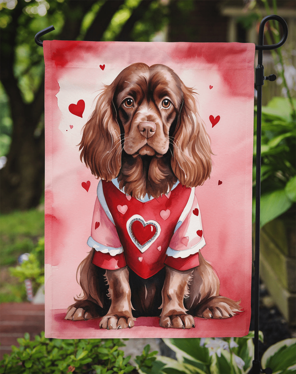 Garden Flag featuring breed specific Sussex Spaniel artwork. Celebrate Valentine's Day with this Valentine's Day Garden Flag. Enhance the beauty of your garden, patio, or yard with Caroline's Treasures Decorative Garden Flag, proudly made in the USA. Crafted from two pieces of thick, double-sided polyester fabric, this 2-ply garden flag is designed to withstand various weather conditions, making it water-resistant and weatherproof. Featuring correctly readable words on both sides, this garden flag offers a delightful visual experience from any angle. With its heavier weight, it stands out among other garden flags, ensuring stability and durability even in wind, rain, and snow. Measuring approximately 11 1/4 inches by 15 1/2 inches, this flag allows you to personalize your outdoor decor. It comes with a 1 1/2-inch sleeve sewn in, allowing easy attachment to any standard garden flag stand or garden size porch hanger (sold separately). Make a statement in your outdoor space with Caroline's Treasures Decorative Garden Flag, a vibrant and high-quality flag that adds color and personality to your surroundings. Proudly made in the USA, it's a symbol of quality craftsmanship and attention to detail.