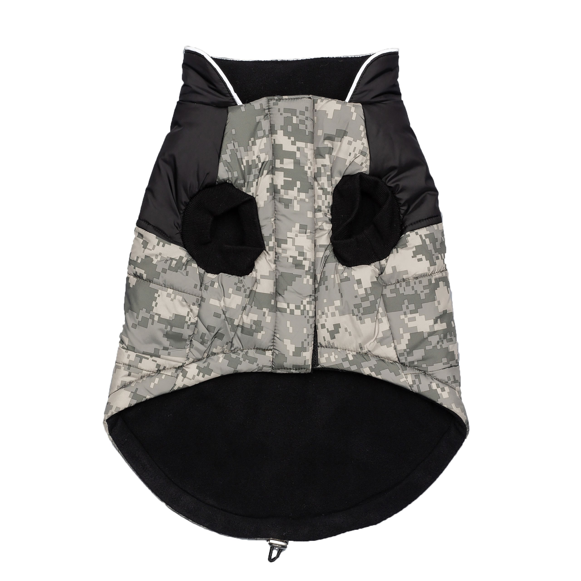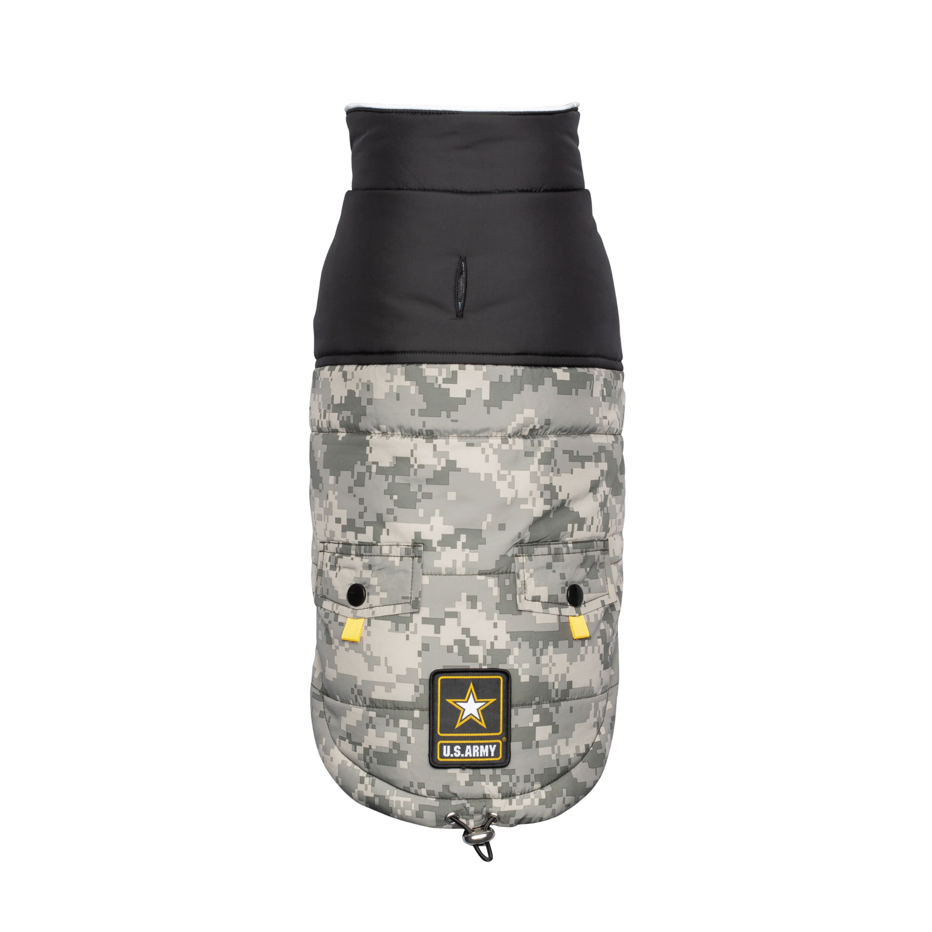 This official licensed US Army® Dog Jacket is the best match for sporty dogs. Its 2-tone design and polar fleece lining will keep your dog warm in any adventure!  With its reflective piping, faux pockets  and a convenient leash hole, this great value dog coat is the perfect patriotic statement for your active pooch! Fit your dog easily through the front velcro closure and adjust the bungee cord.  Camo (army camouflage print) with yellow detail and official US Army logo patch.