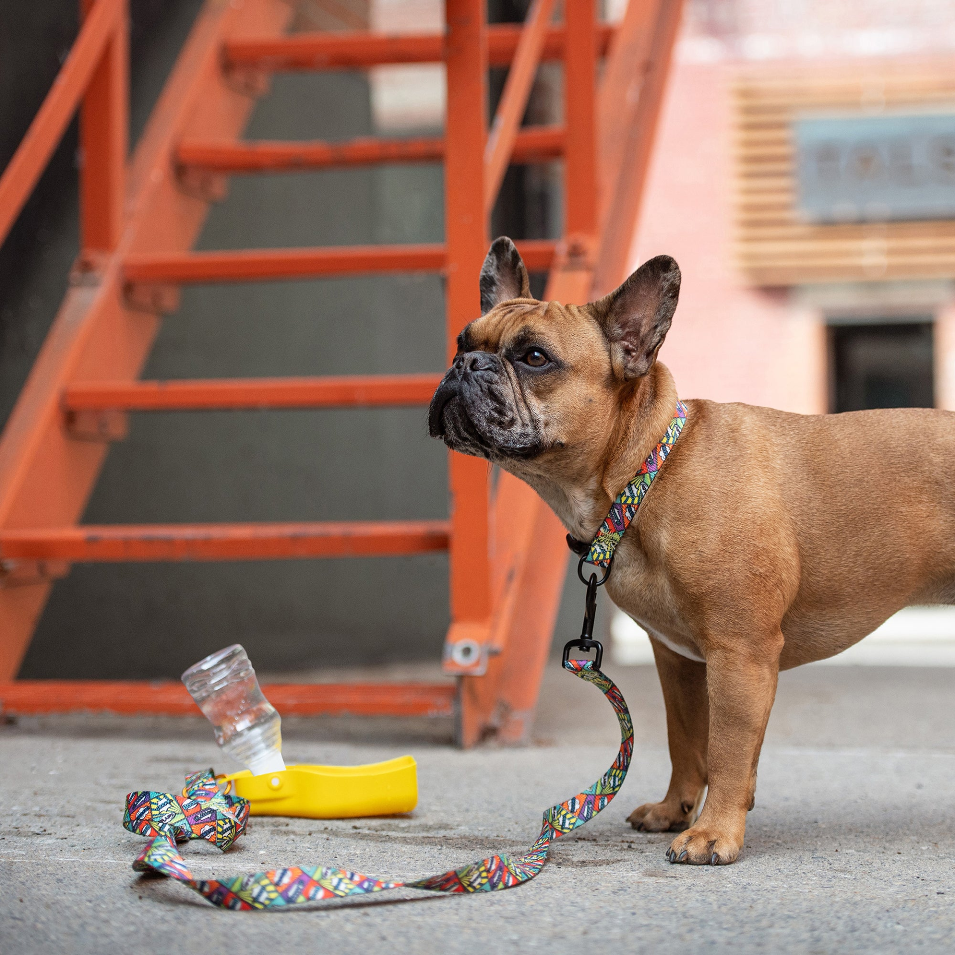The lid acts as a bowl when unfolded. When ready to go, simply clip the bottle to a lead, belt, or backpack.