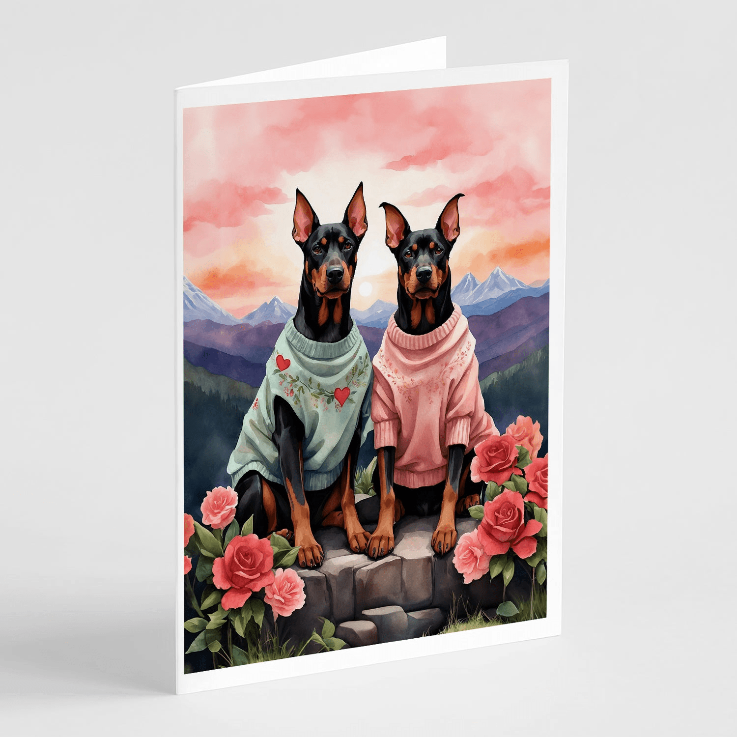 Greeting Cards Pack of 8 featuring breed specific Doberman Pinscher artwork. Celebrate Valentine's Day with this Valentine's Day . Celebrate special moments with Caroline's Treasures Printed Greeting Card Pack. This pack includes eight beautifully folded 5x7 cards, accompanied by eight matching white envelopes. With blank interiors, these cards provide ample space for your personalized messages and heartfelt holiday greetings. Each card features captivating full-color artwork, meticulously printed in our facility on high-quality 80 lb cover stock or 216 GSM. The super smooth finish of the white cards enhances the visual impact of the artwork, creating a truly stunning presentation. Designed by our talented in-house artists or licensed artists, the artwork on these cards showcases their creativity and attention to detail. From vibrant illustrations to captivating designs, each card tells its own unique story. Whether it's for birthdays, anniversaries, holidays, or any special occasion, Caroline's Treasures Greeting Card Pack is the perfect way to convey your heartfelt sentiments. Share joy, love, and warm wishes with these exquisite cards and make every moment unforgettable.