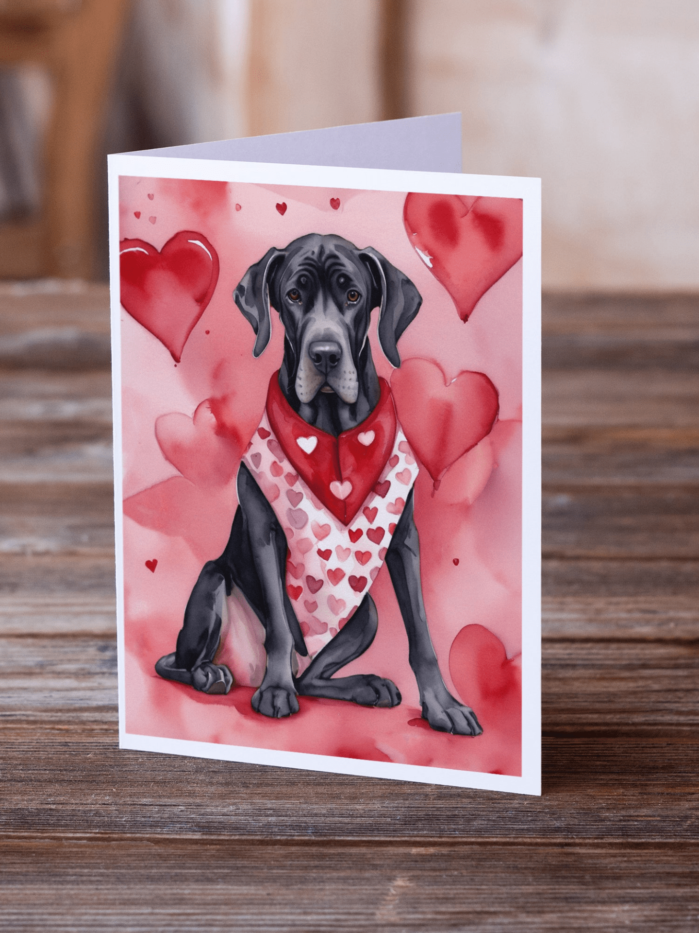 Greeting Cards Pack of 8 featuring breed specific Great Dane artwork. Celebrate Valentine's Day with this Valentine's Day . Celebrate special moments with Caroline's Treasures Printed Greeting Card Pack. This pack includes eight beautifully folded 5x7 cards, accompanied by eight matching white envelopes. With blank interiors, these cards provide ample space for your personalized messages and heartfelt holiday greetings. Each card features captivating full-color artwork, meticulously printed in our facility on high-quality 80 lb cover stock or 216 GSM. The super smooth finish of the white cards enhances the visual impact of the artwork, creating a truly stunning presentation. Designed by our talented in-house artists or licensed artists, the artwork on these cards showcases their creativity and attention to detail. From vibrant illustrations to captivating designs, each card tells its own unique story. Whether it's for birthdays, anniversaries, holidays, or any special occasion, Caroline's Treasures Greeting Card Pack is the perfect way to convey your heartfelt sentiments. Share joy, love, and warm wishes with these exquisite cards and make every moment unforgettable.