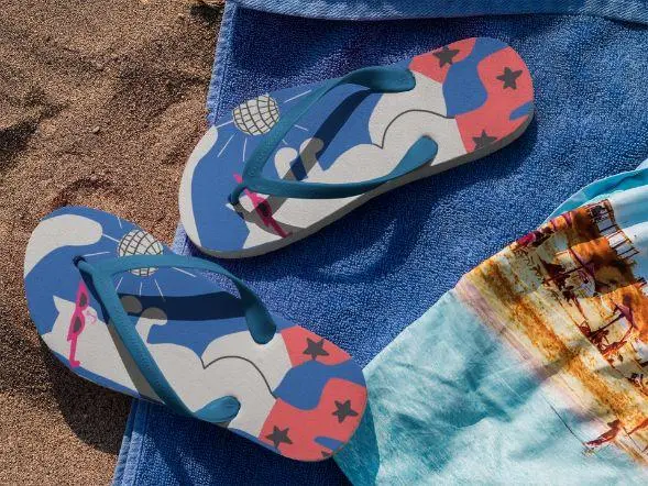 Step out in style in these unique customized flip flops, with printed fabric top side and black soles and straps. S = EU 37-39, M = EU 40-43, L = EU 44-47.
