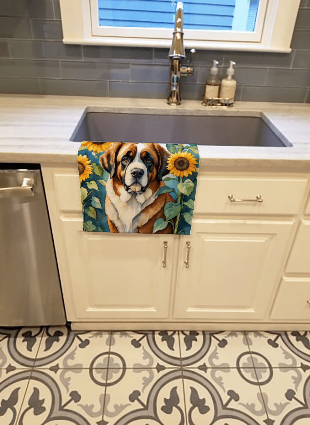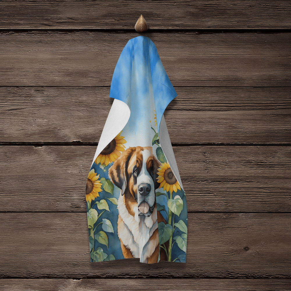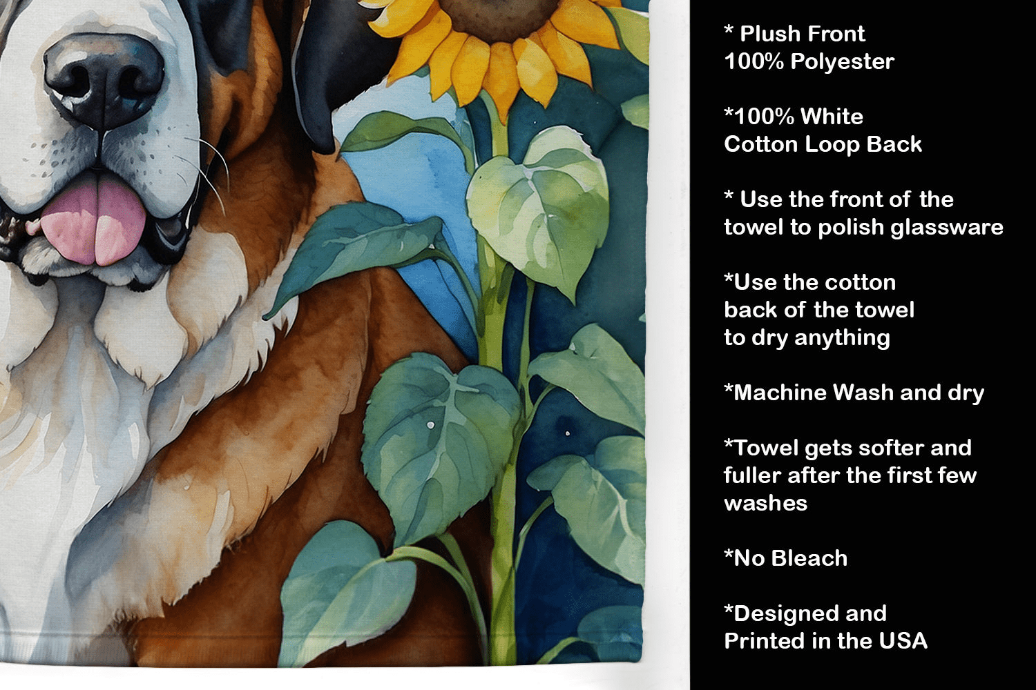 Kitchen Towel featuring breed specific Saint Bernard artwork. Experience the perfect blend of aesthetic appeal and functional excellence with our Plush Velour Kitchen Towels. These are not your ordinary decorative kitchen towels that gather dust. Instead, they are designed to be as practical as they are stylish. The front layer of our towel is constructed from a minky plush polyester, known for its durability and color retention. Unlike conventional kitchen towels, the artwork on our towels is dyed directly into the fabric, ensuring vibrant colors that last. Polish your glassware to a brilliant sparkle using the plush front side of the towel. Flip to the back, crafted from 100% cotton terry loop, to exploit its exceptional absorbency for drying dishes or wiping down counters. Our kitchen towels redefine the concept of functional art, offering lasting quality that maintains the towel's shape over time. Measuring 15 inches by 25 inches and weighing 2.3 lbs per dozen, these towels deliver an overwhelming sensory experience with their soft, plush, and smooth texture. The edges are meticulously finished with binding, enhancing their durability and visual appeal. For your convenience, these towels are machine washable and can be dried on low heat. After the first wash, the top fabric becomes even softer and fluffier, eliminating the need for ironing. Treat your kitchen to the luxury and functionality it deserves with our plush velour kitchen towels.