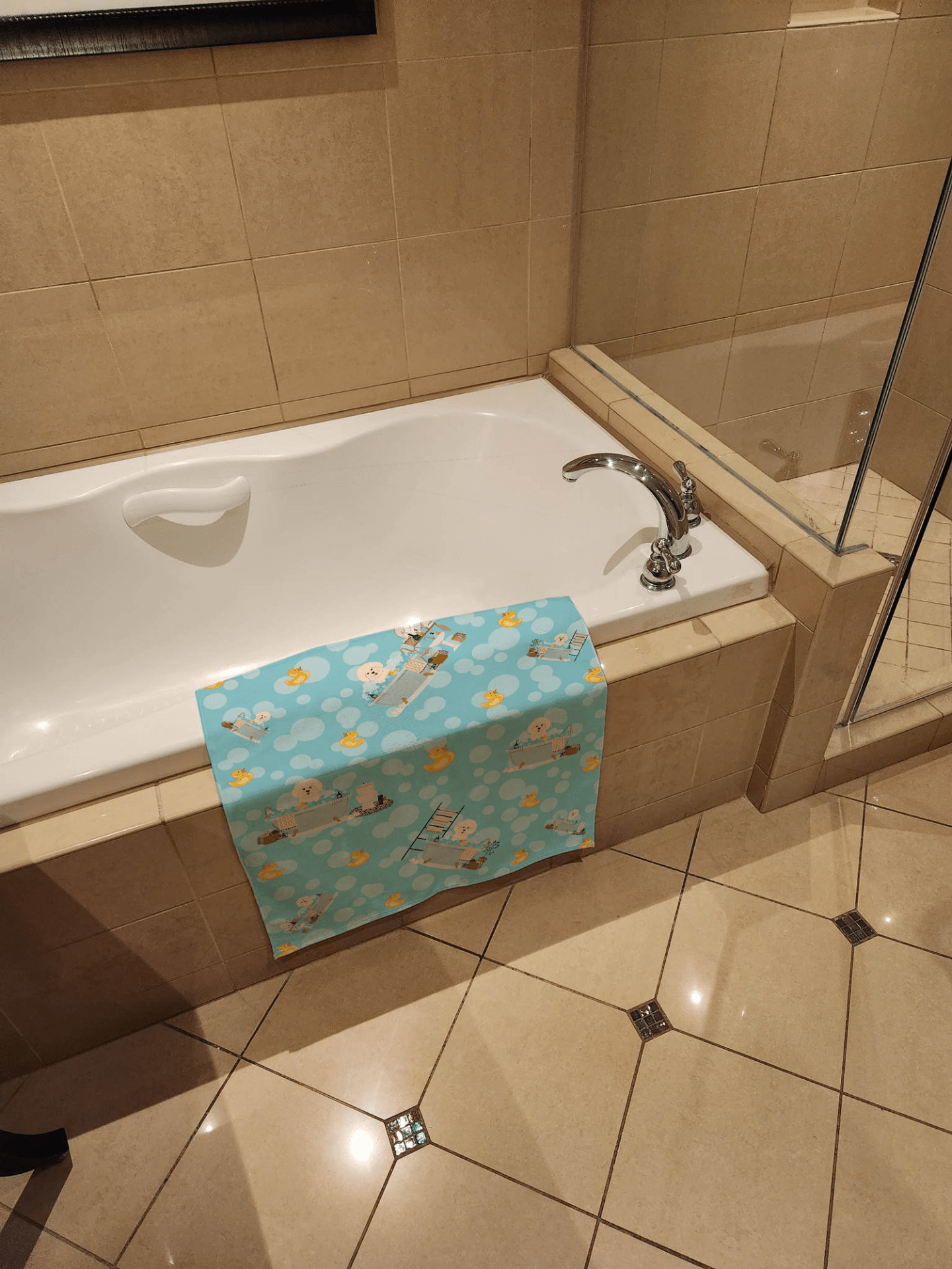 - Design: Full-color edge-to-edge artwork featuring Bichon Frise in a bathtub