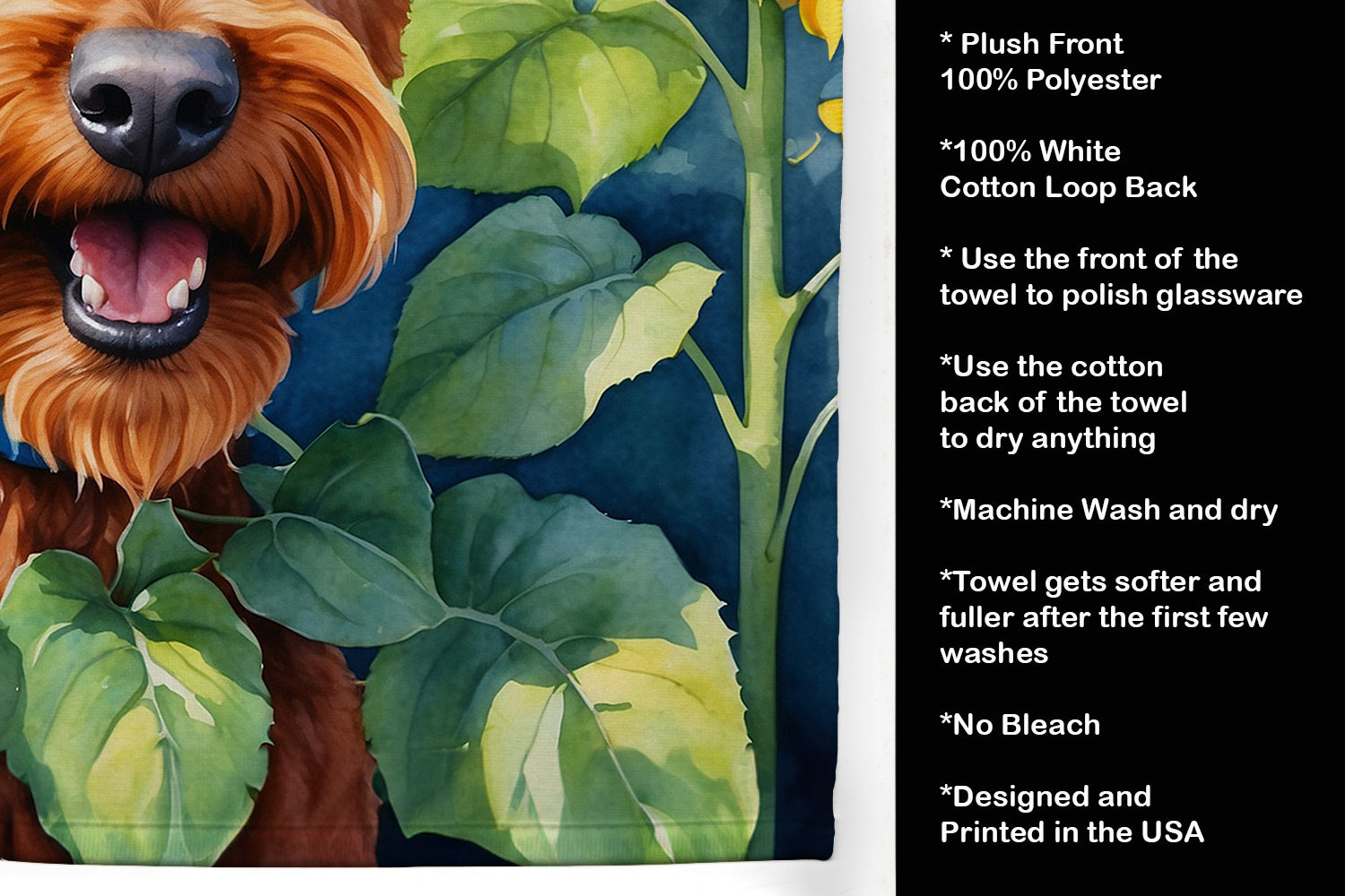 Kitchen Towel featuring breed specific Irish Terrier artwork. Experience the perfect blend of aesthetic appeal and functional excellence with our Plush Velour Kitchen Towels. These are not your ordinary decorative kitchen towels that gather dust. Instead, they are designed to be as practical as they are stylish. The front layer of our towel is constructed from a minky plush polyester, known for its durability and color retention. Unlike conventional kitchen towels, the artwork on our towels is dyed directly into the fabric, ensuring vibrant colors that last. Polish your glassware to a brilliant sparkle using the plush front side of the towel. Flip to the back, crafted from 100% cotton terry loop, to exploit its exceptional absorbency for drying dishes or wiping down counters. Our kitchen towels redefine the concept of functional art, offering lasting quality that maintains the towel's shape over time. Measuring 15 inches by 25 inches and weighing 2.3 lbs per dozen, these towels deliver an overwhelming sensory experience with their soft, plush, and smooth texture. The edges are meticulously finished with binding, enhancing their durability and visual appeal. For your convenience, these towels are machine washable and can be dried on low heat. After the first wash, the top fabric becomes even softer and fluffier, eliminating the need for ironing. Treat your kitchen to the luxury and functionality it deserves with our plush velour kitchen towels.