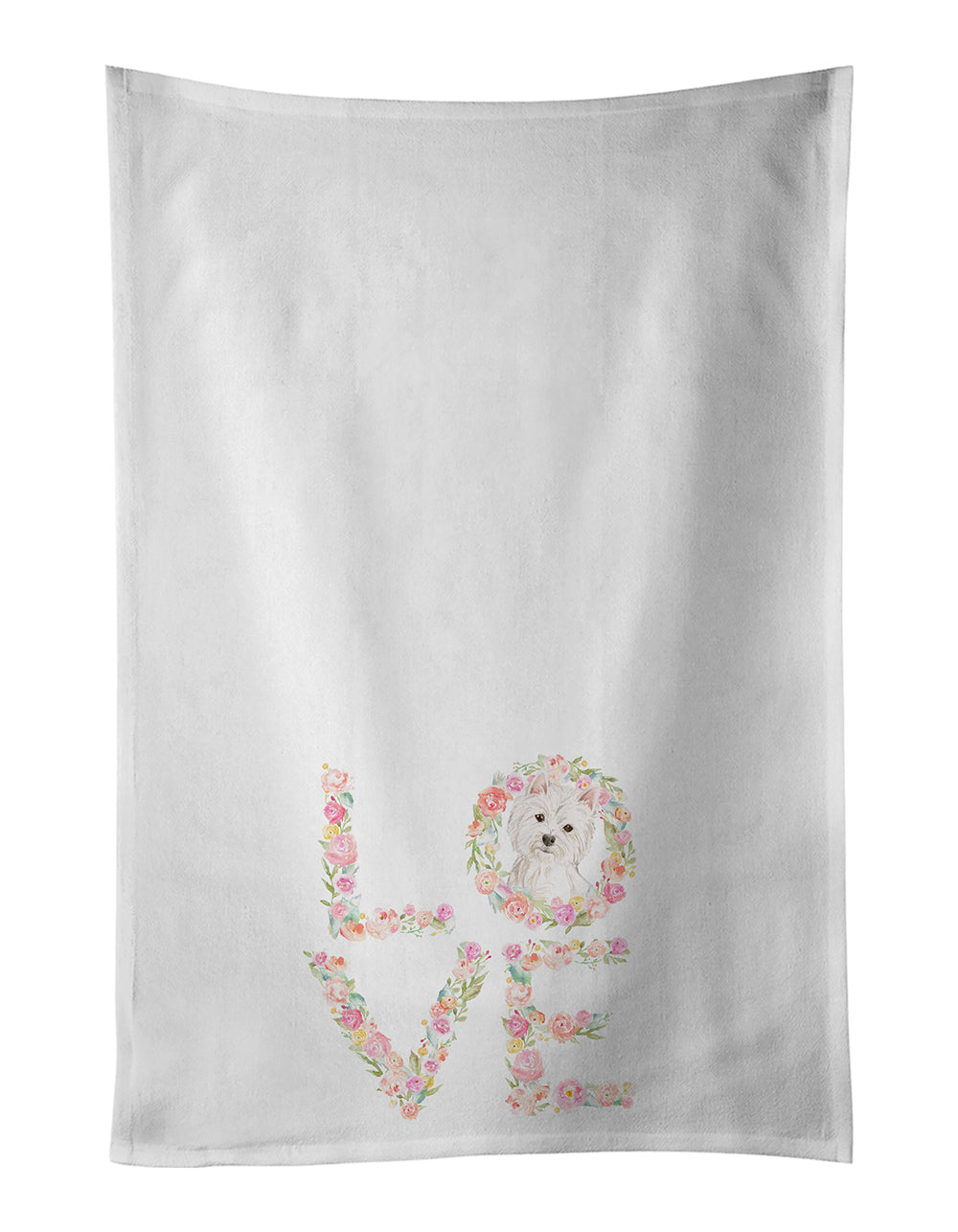 Kitchen Towel Set of 2 featuring breed specific West Highland White Terrier artwork. Celebrate Valentine's Day with this Valentine's Day Kitchen Cotton Towels. This Kitchen Towel Set of 2 is from Caroline's Treasures collection LOVE. Spruce up your kitchen decor with Caroline's Treasures Decorative White Kitchen Towel Set. This set of two dish towels showcases beautiful artwork from one of our talented artists, making them both practical and visually appealing. These towels are crafted from 100% cotton, offering excellent absorbency and durability, making them ideal for any kitchen task. Each white towel measures 19 inches by 28 inches, providing ample coverage for drying dishes or wiping up spills. The standout feature of these towels is the full-color artwork design printed on each one. They can serve as a vibrant accent in your kitchen, turning a functional item into a delightful piece of decor. When it comes to care, these towels are machine washable in cold water and can be dried on low heat. Remember to always use a pressing cloth when pressing the design, and avoid using bleach on the decorated towel. The Decorative White Kitchen Towel Set makes a great gift or a stylish addition to your own kitchen.