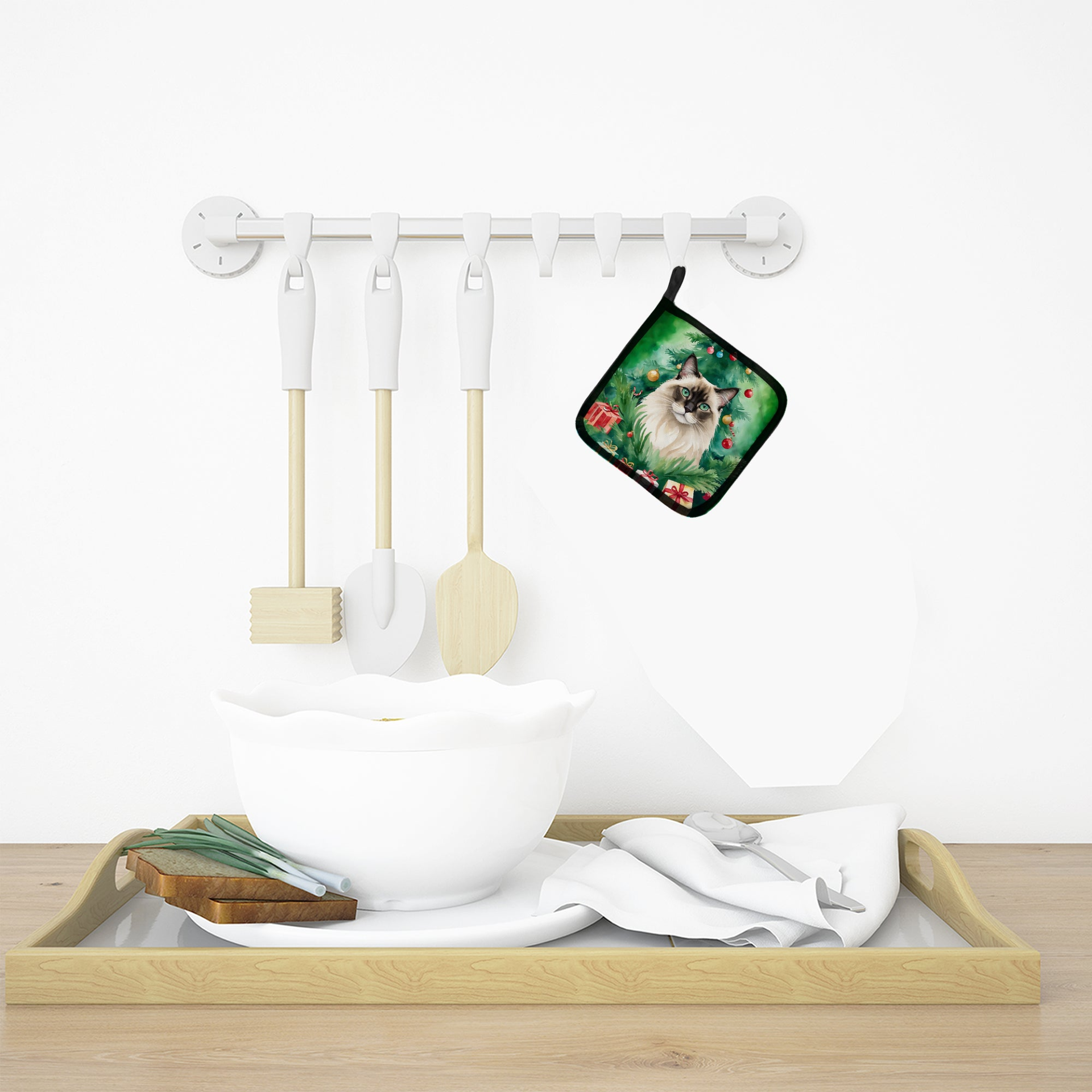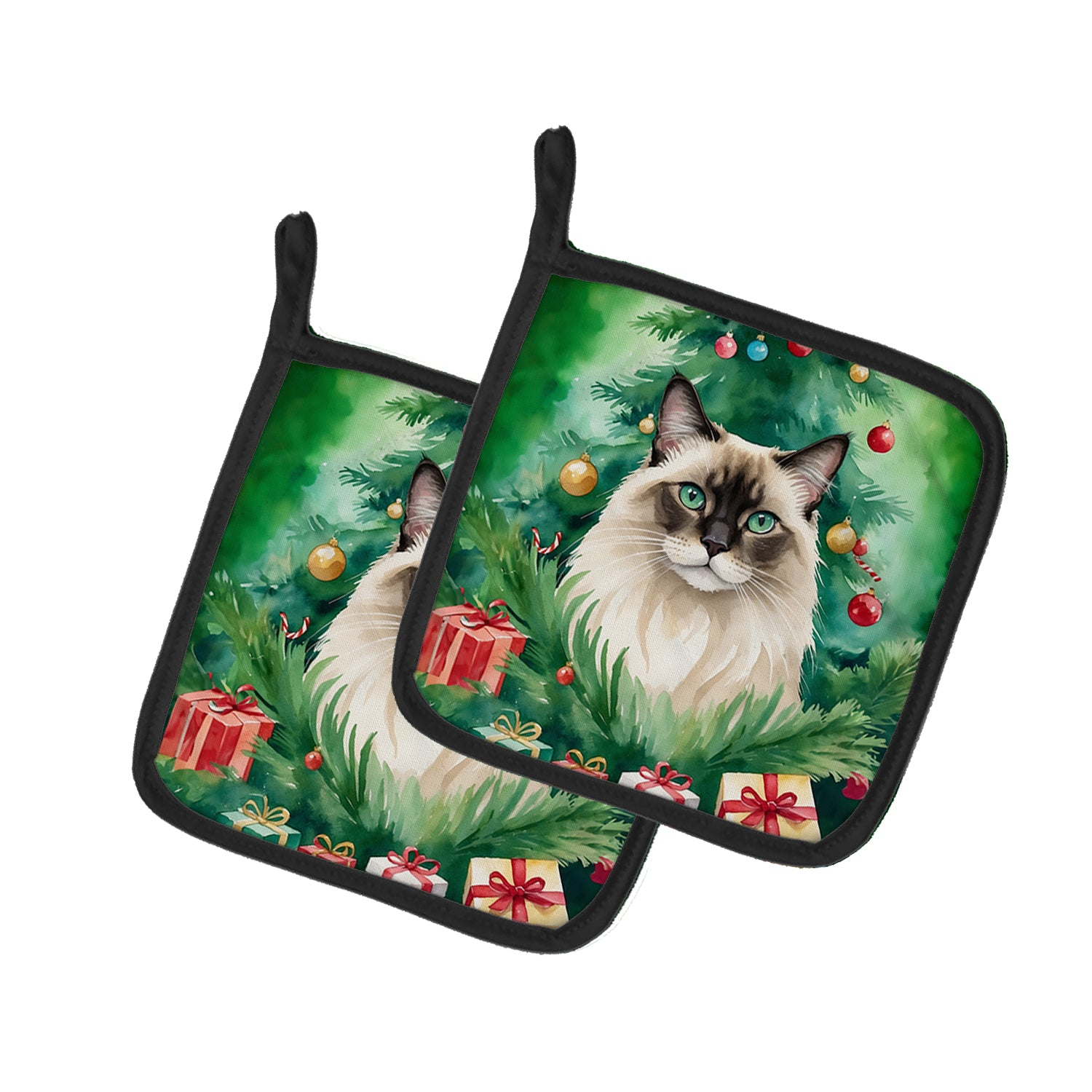 Pair of Pot Holders featuring breed specific Balinese artwork. Celebrate Christmas with this Christmas Pair of Pot Holders. A Pair of Pot Holders to match your kitchen decor. Made in the USA these are thick and functional. Full color artwork decorates the front polyester fabric of the hot pad and accented by a black trim. Use these at as a trivet for your Thanksgiving or Christmas tablescape. Filled with insulated fabric and quilted for durability. These colorful pot holders will make a great gift for your favorite home cook or executive chef. Each pot holder measures approximately 7 1/2 inches by 7 1/2 inches. A hanging tab is included.