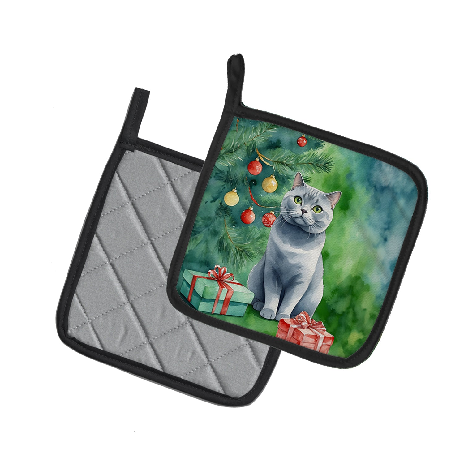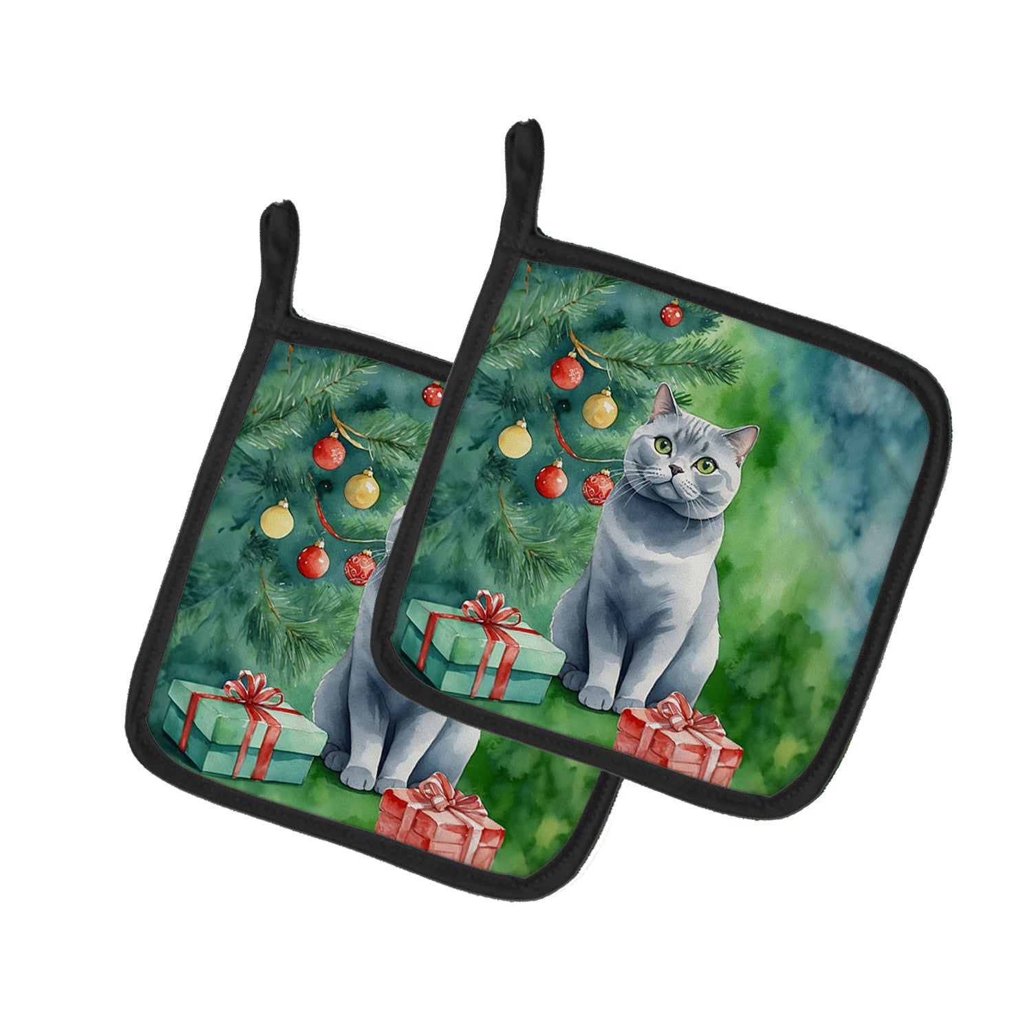 British Shorthair Cat By the Christmas Tree Pair of Pot Holders