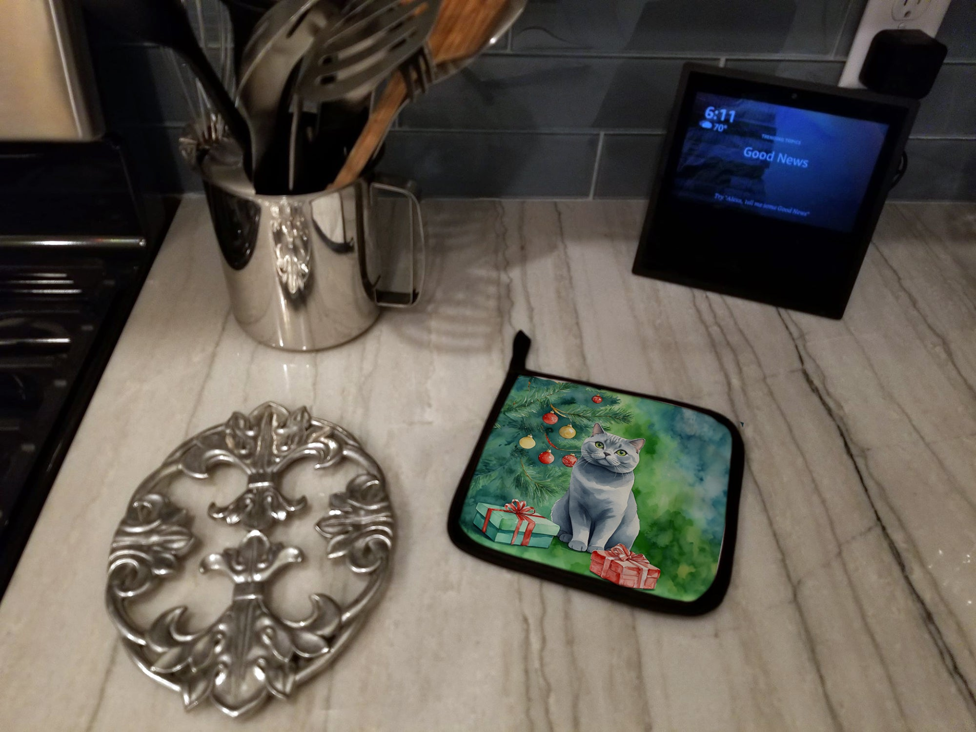Pair of Pot Holders featuring breed specific British Shorthair artwork. Celebrate Christmas with this Christmas Pair of Pot Holders. A Pair of Pot Holders to match your kitchen decor. Made in the USA these are thick and functional. Full color artwork decorates the front polyester fabric of the hot pad and accented by a black trim. Use these at as a trivet for your Thanksgiving or Christmas tablescape. Filled with insulated fabric and quilted for durability. These colorful pot holders will make a great gift for your favorite home cook or executive chef. Each pot holder measures approximately 7 1/2 inches by 7 1/2 inches. A hanging tab is included.