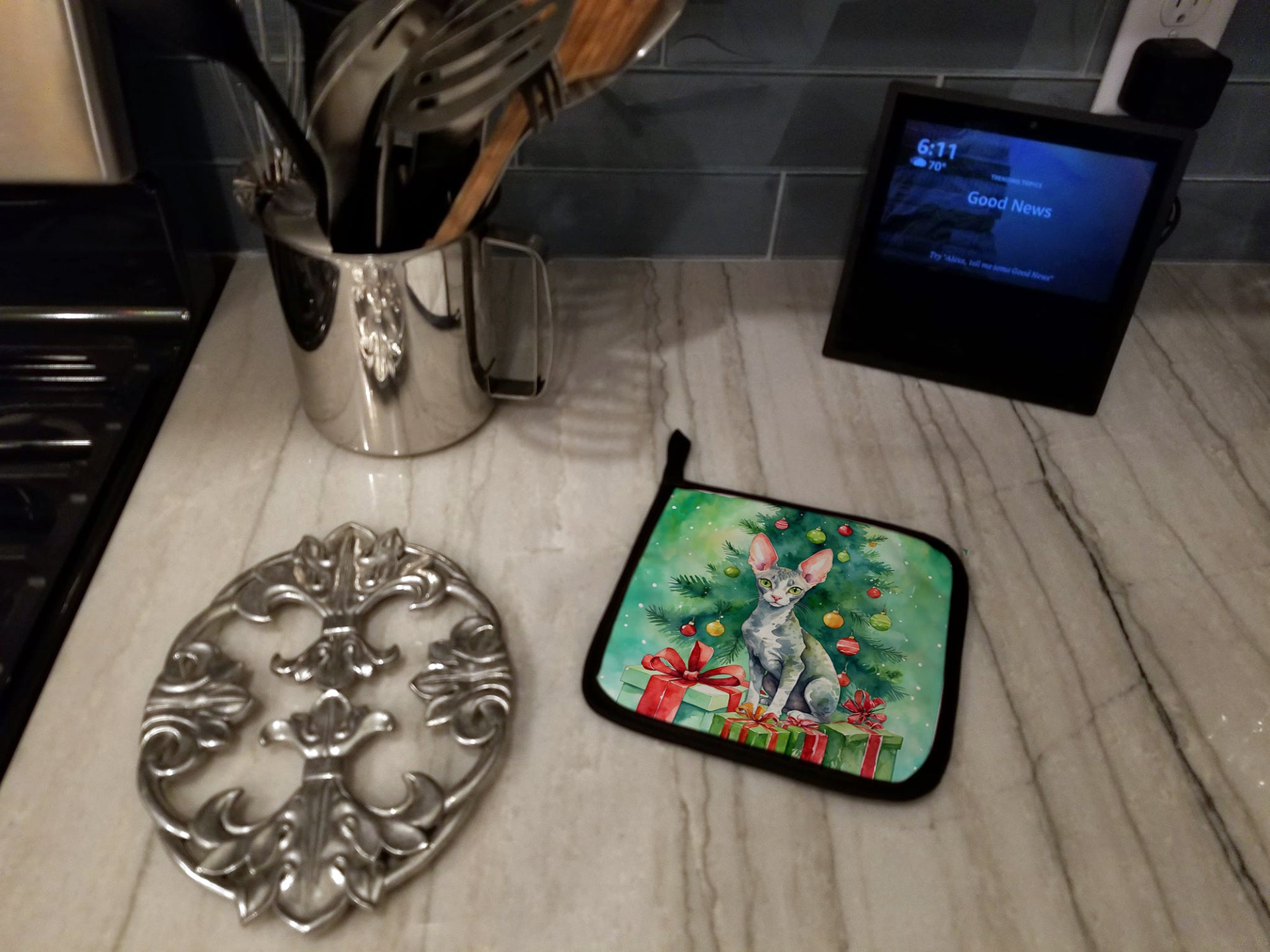 Pair of Pot Holders featuring breed specific Cornish Rex artwork. Celebrate Christmas with this Christmas Pair of Pot Holders. A Pair of Pot Holders to match your kitchen decor. Made in the USA these are thick and functional. Full color artwork decorates the front polyester fabric of the hot pad and accented by a black trim. Use these at as a trivet for your Thanksgiving or Christmas tablescape. Filled with insulated fabric and quilted for durability. These colorful pot holders will make a great gift for your favorite home cook or executive chef. Each pot holder measures approximately 7 1/2 inches by 7 1/2 inches. A hanging tab is included.