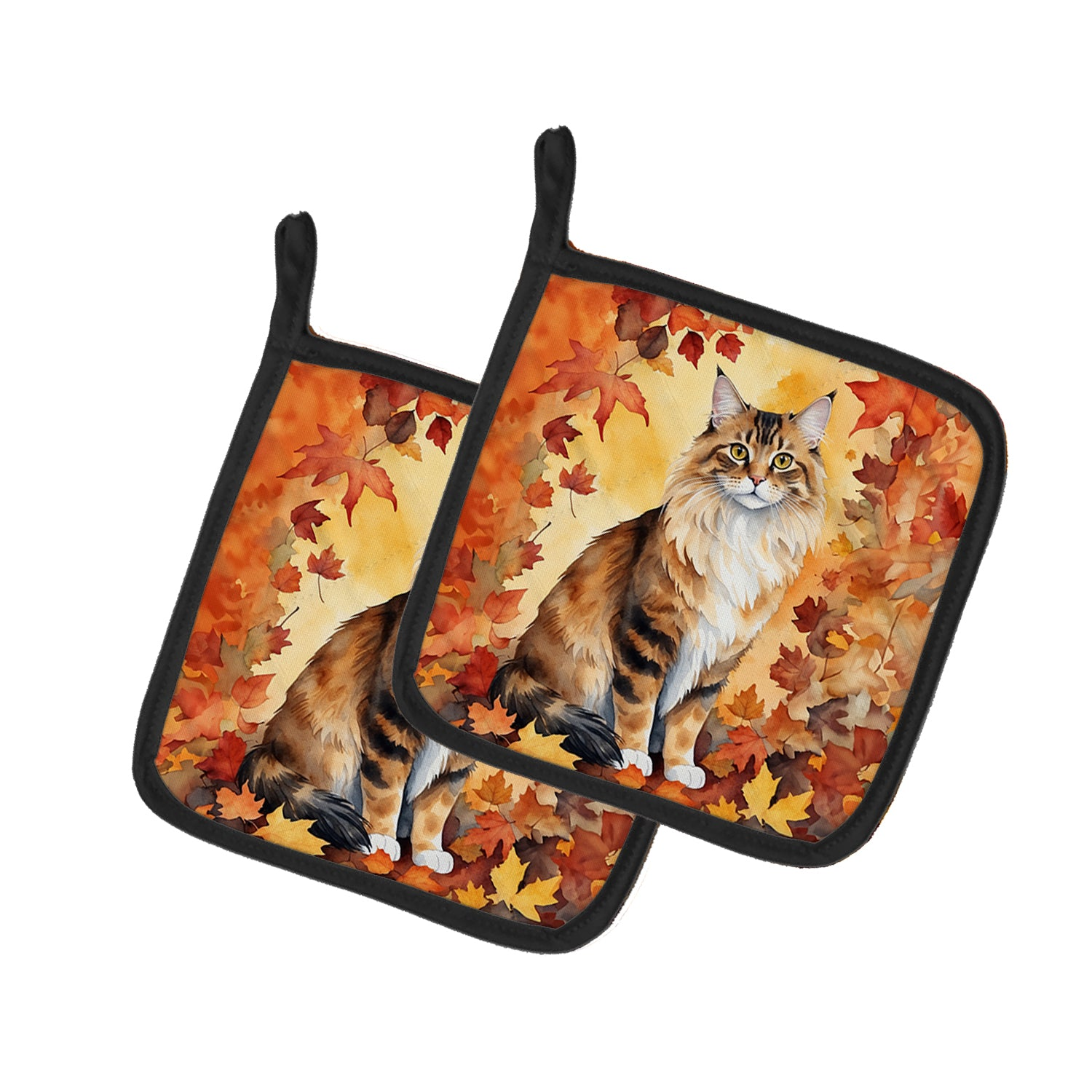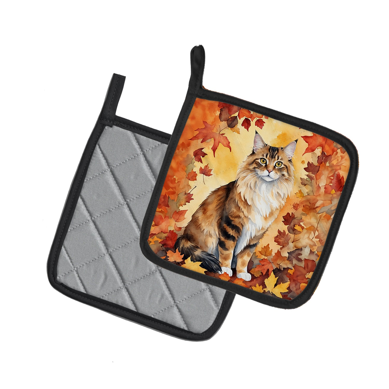 Cymric Cat in Fall Leaves Pair of Pot Holders