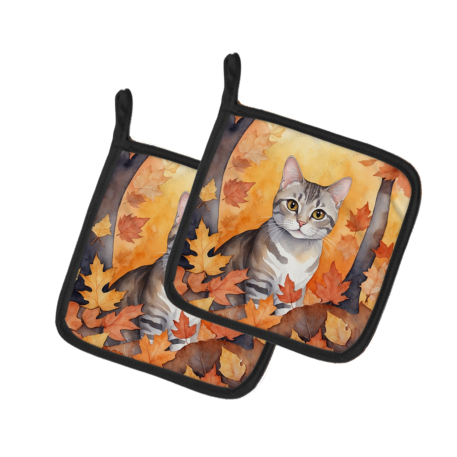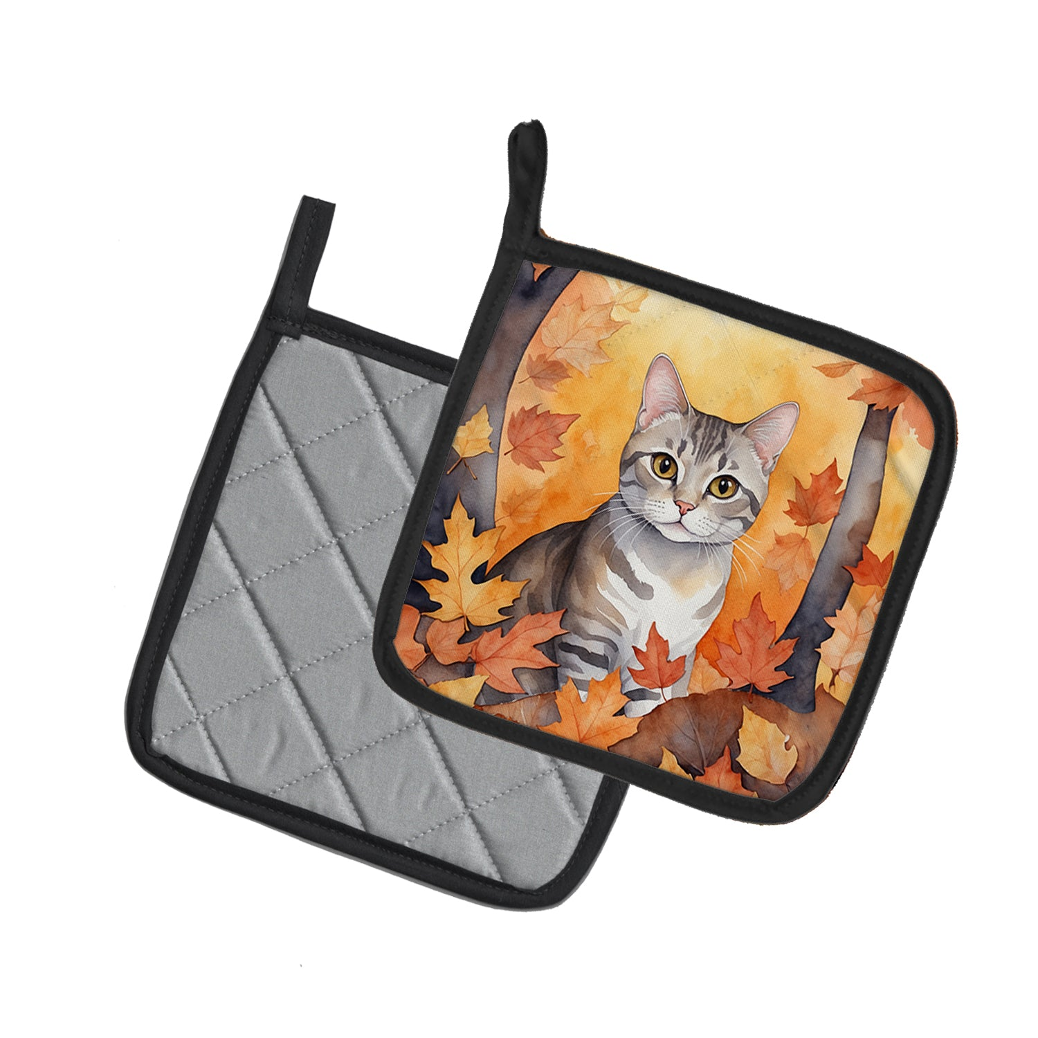 Pair of Pot Holders featuring breed specific European Shorthair artwork. A Pair of Pot Holders to match your kitchen decor. Made in the USA these are thick and functional. Full color artwork decorates the front polyester fabric of the hot pad and accented by a black trim. Use these at as a trivet for your Thanksgiving or Christmas tablescape. Filled with insulated fabric and quilted for durability. These colorful pot holders will make a great gift for your favorite home cook or executive chef. Each pot holder measures approximately 7 1/2 inches by 7 1/2 inches. A hanging tab is included.