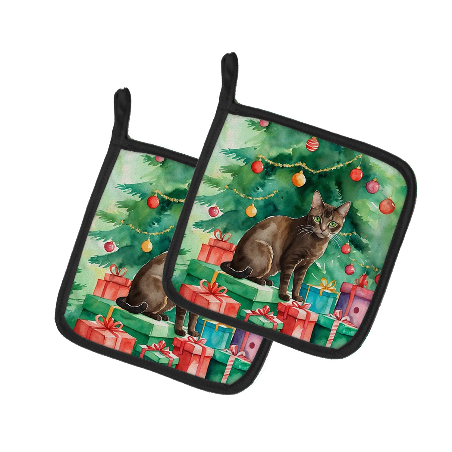 Pair of Pot Holders featuring breed specific Havana Brown artwork. Celebrate Christmas with this Christmas Pair of Pot Holders. A Pair of Pot Holders to match your kitchen decor. Made in the USA these are thick and functional. Full color artwork decorates the front polyester fabric of the hot pad and accented by a black trim. Use these at as a trivet for your Thanksgiving or Christmas tablescape. Filled with insulated fabric and quilted for durability. These colorful pot holders will make a great gift for your favorite home cook or executive chef. Each pot holder measures approximately 7 1/2 inches by 7 1/2 inches. A hanging tab is included.