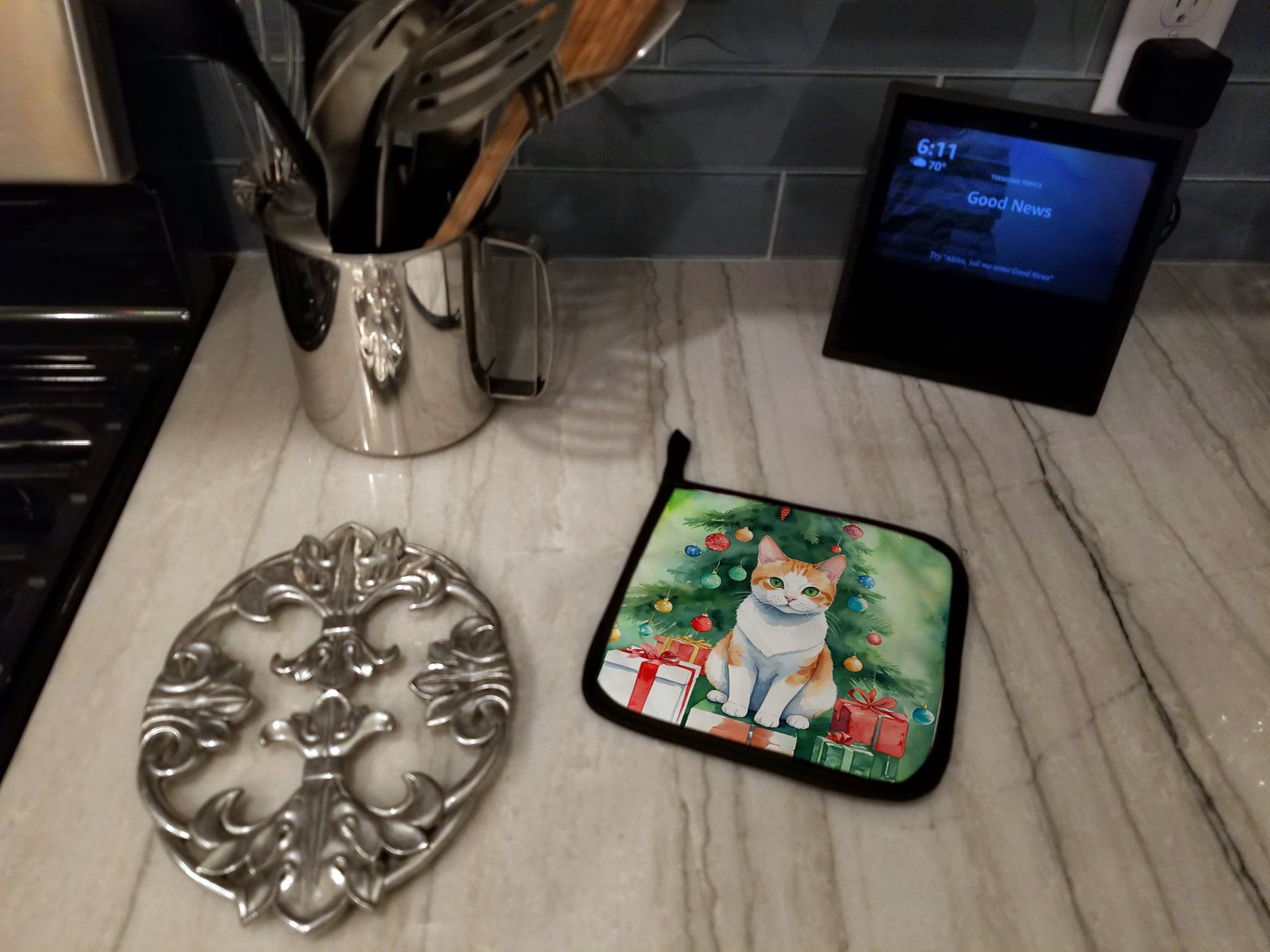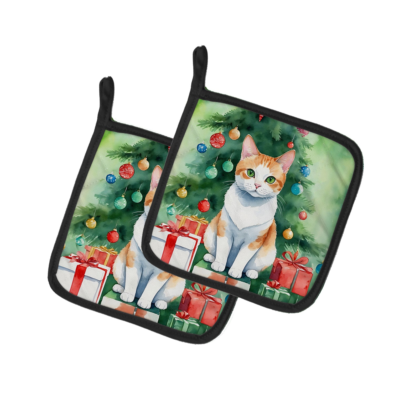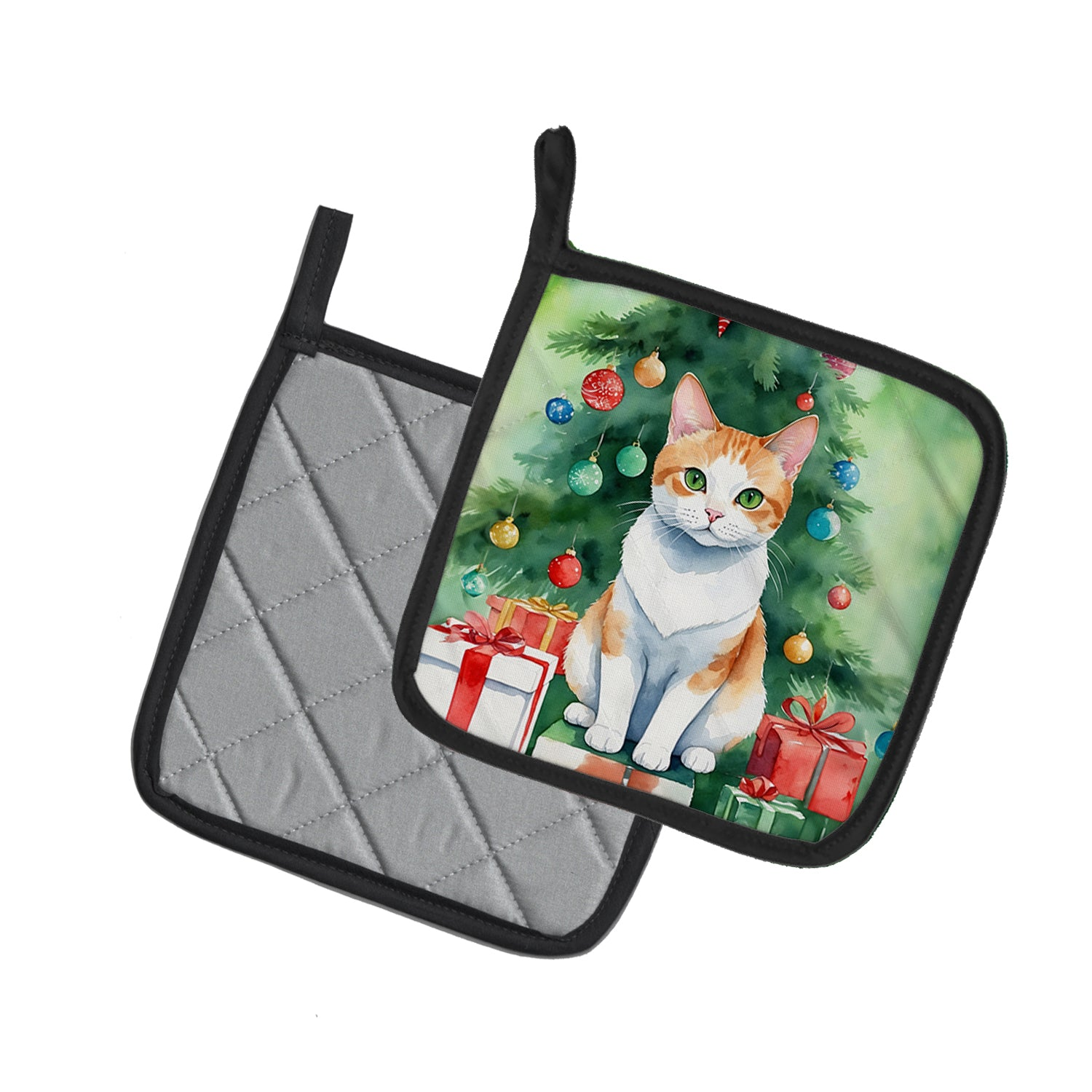 Pair of Pot Holders featuring breed specific Japanese Bobtail artwork. Celebrate Christmas with this Christmas Pair of Pot Holders. A Pair of Pot Holders to match your kitchen decor. Made in the USA these are thick and functional. Full color artwork decorates the front polyester fabric of the hot pad and accented by a black trim. Use these at as a trivet for your Thanksgiving or Christmas tablescape. Filled with insulated fabric and quilted for durability. These colorful pot holders will make a great gift for your favorite home cook or executive chef. Each pot holder measures approximately 7 1/2 inches by 7 1/2 inches. A hanging tab is included.