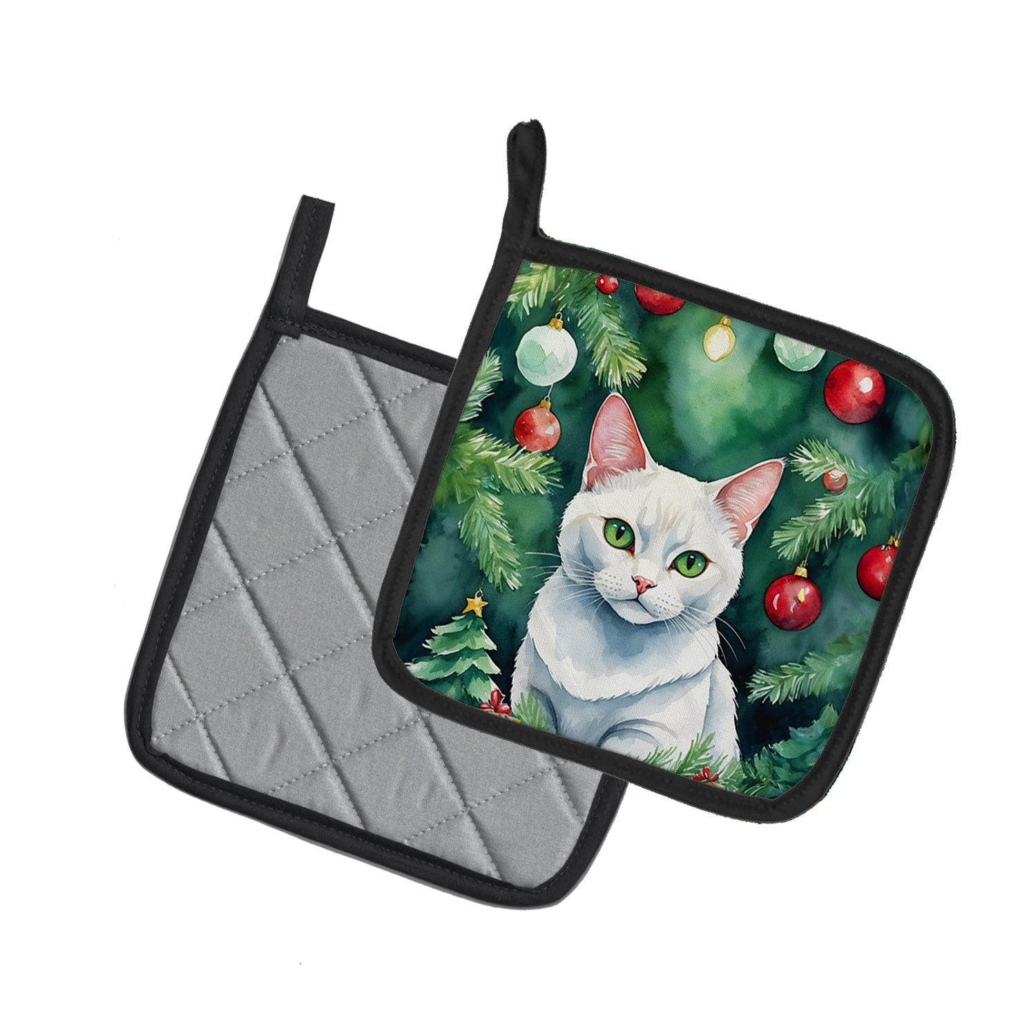 Khao Manee Cat By the Christmas Tree Pair of Pot Holders