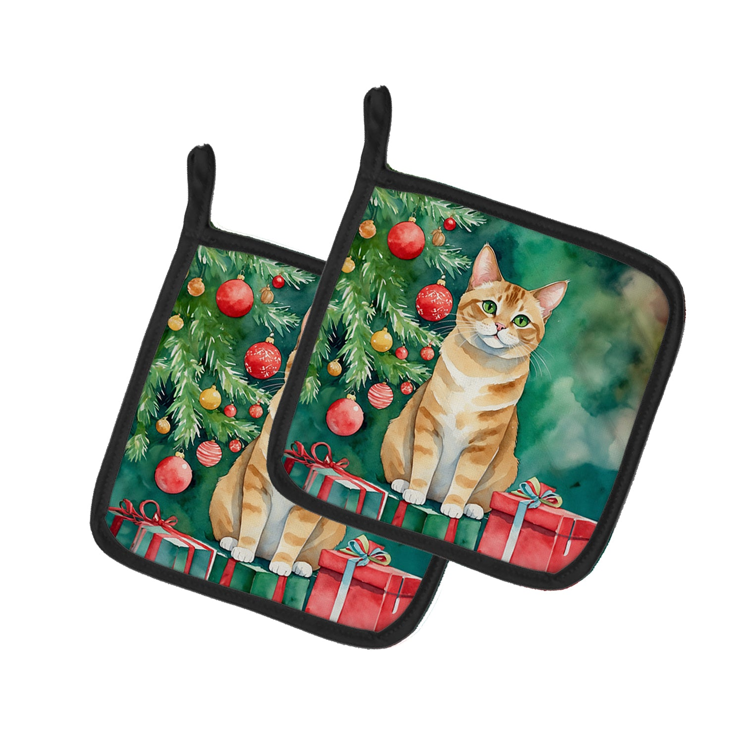 Pair of Pot Holders featuring breed specific Malayan artwork. Celebrate Christmas with this Christmas Pair of Pot Holders. A Pair of Pot Holders to match your kitchen decor. Made in the USA these are thick and functional. Full color artwork decorates the front polyester fabric of the hot pad and accented by a black trim. Use these at as a trivet for your Thanksgiving or Christmas tablescape. Filled with insulated fabric and quilted for durability. These colorful pot holders will make a great gift for your favorite home cook or executive chef. Each pot holder measures approximately 7 1/2 inches by 7 1/2 inches. A hanging tab is included.