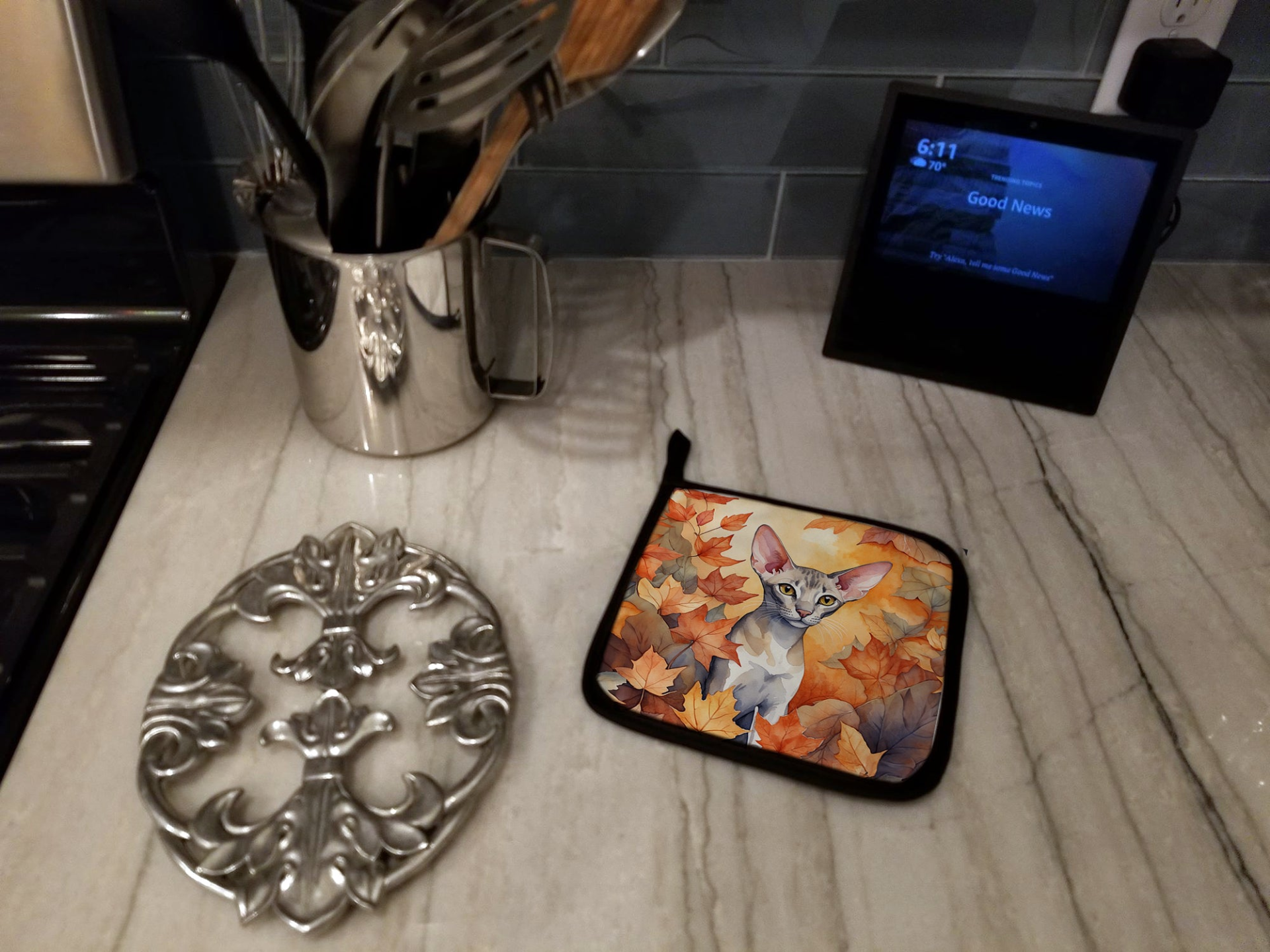 Pair of Pot Holders featuring breed specific Oriental Shorthair artwork. A Pair of Pot Holders to match your kitchen decor. Made in the USA these are thick and functional. Full color artwork decorates the front polyester fabric of the hot pad and accented by a black trim. Use these at as a trivet for your Thanksgiving or Christmas tablescape. Filled with insulated fabric and quilted for durability. These colorful pot holders will make a great gift for your favorite home cook or executive chef. Each pot holder measures approximately 7 1/2 inches by 7 1/2 inches. A hanging tab is included.