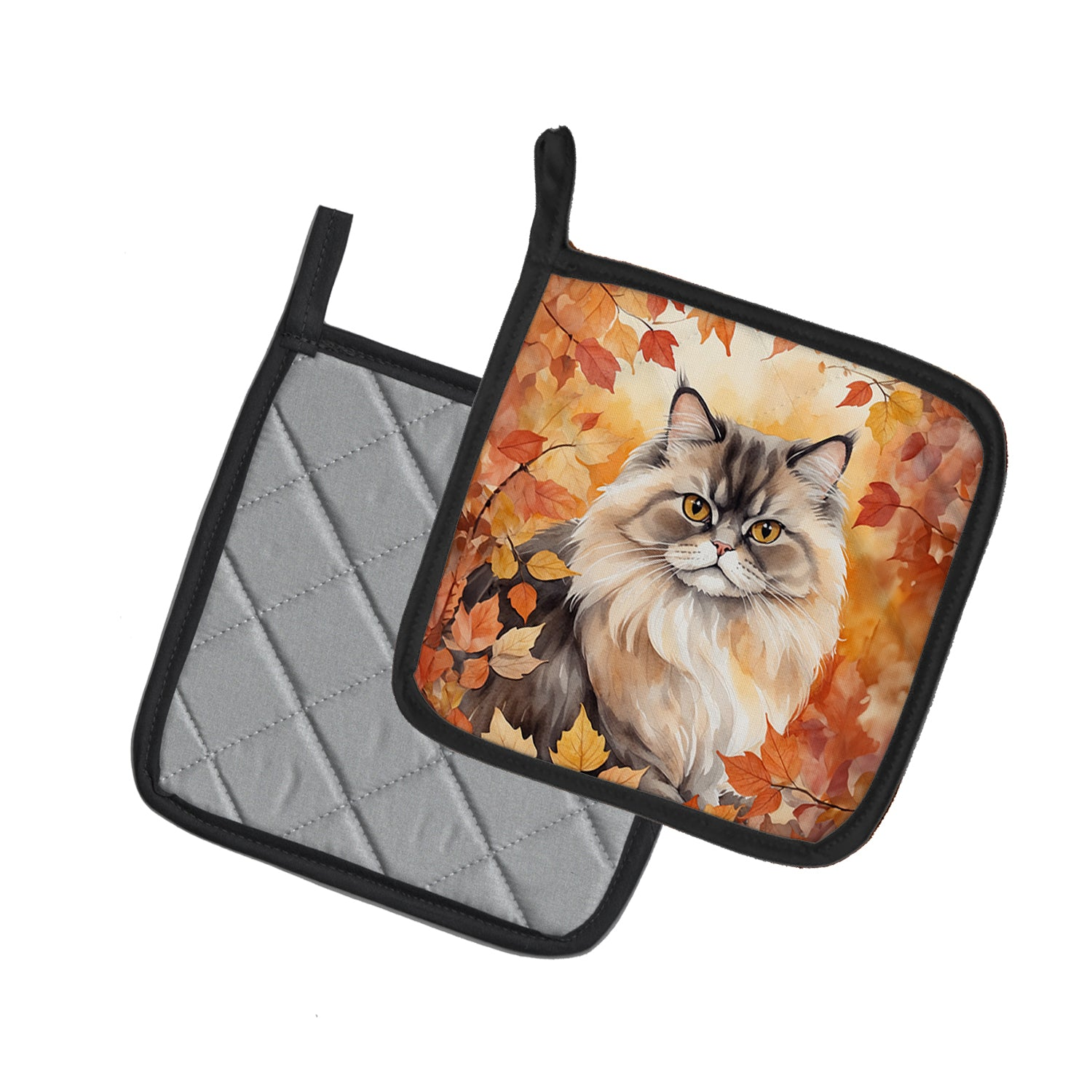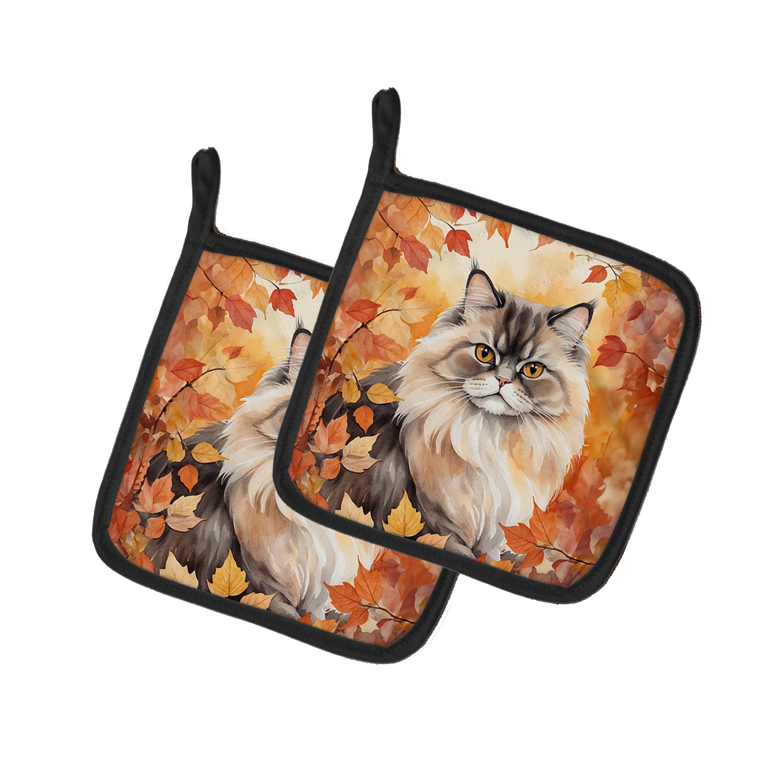 Persian Cat in Fall Leaves Pair of Pot Holders