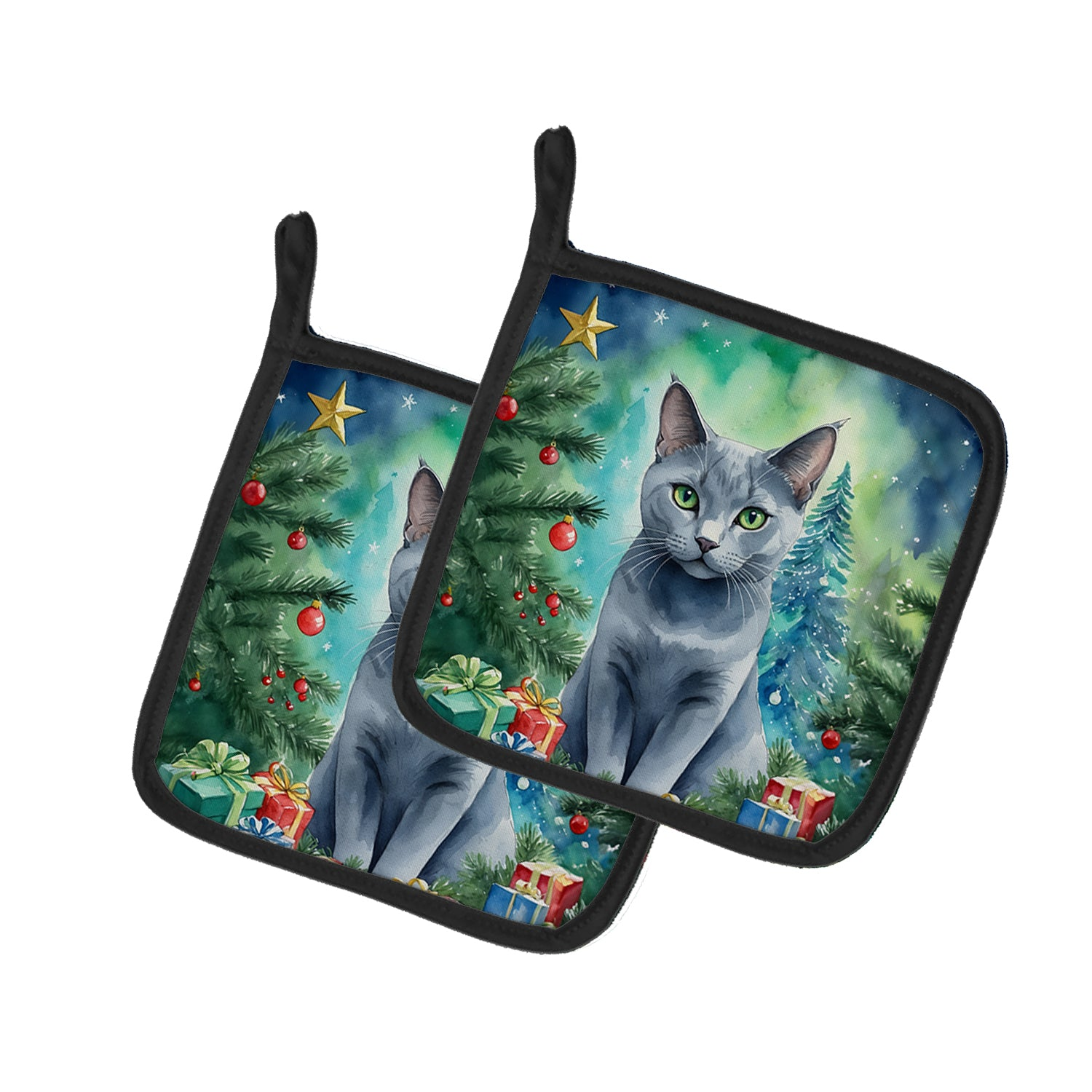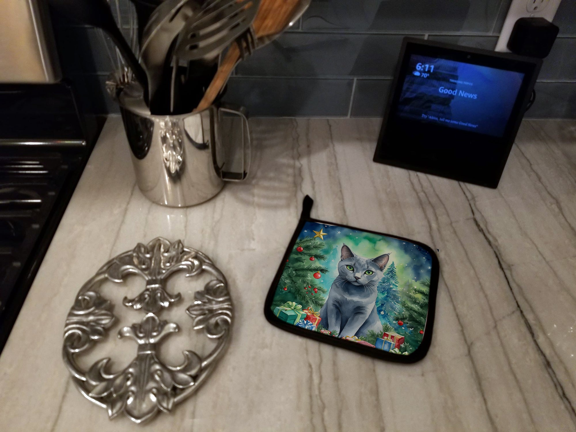 Pair of Pot Holders featuring breed specific Russian Blue artwork. Celebrate Christmas with this Christmas Pair of Pot Holders. A Pair of Pot Holders to match your kitchen decor. Made in the USA these are thick and functional. Full color artwork decorates the front polyester fabric of the hot pad and accented by a black trim. Use these at as a trivet for your Thanksgiving or Christmas tablescape. Filled with insulated fabric and quilted for durability. These colorful pot holders will make a great gift for your favorite home cook or executive chef. Each pot holder measures approximately 7 1/2 inches by 7 1/2 inches. A hanging tab is included.