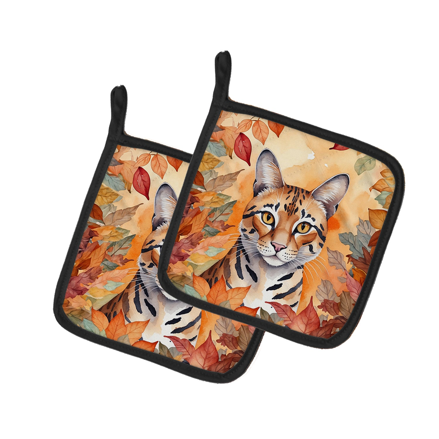 Pair of Pot Holders featuring breed specific Safari Cat artwork. A Pair of Pot Holders to match your kitchen decor. Made in the USA these are thick and functional. Full color artwork decorates the front polyester fabric of the hot pad and accented by a black trim. Use these at as a trivet for your Thanksgiving or Christmas tablescape. Filled with insulated fabric and quilted for durability. These colorful pot holders will make a great gift for your favorite home cook or executive chef. Each pot holder measures approximately 7 1/2 inches by 7 1/2 inches. A hanging tab is included.