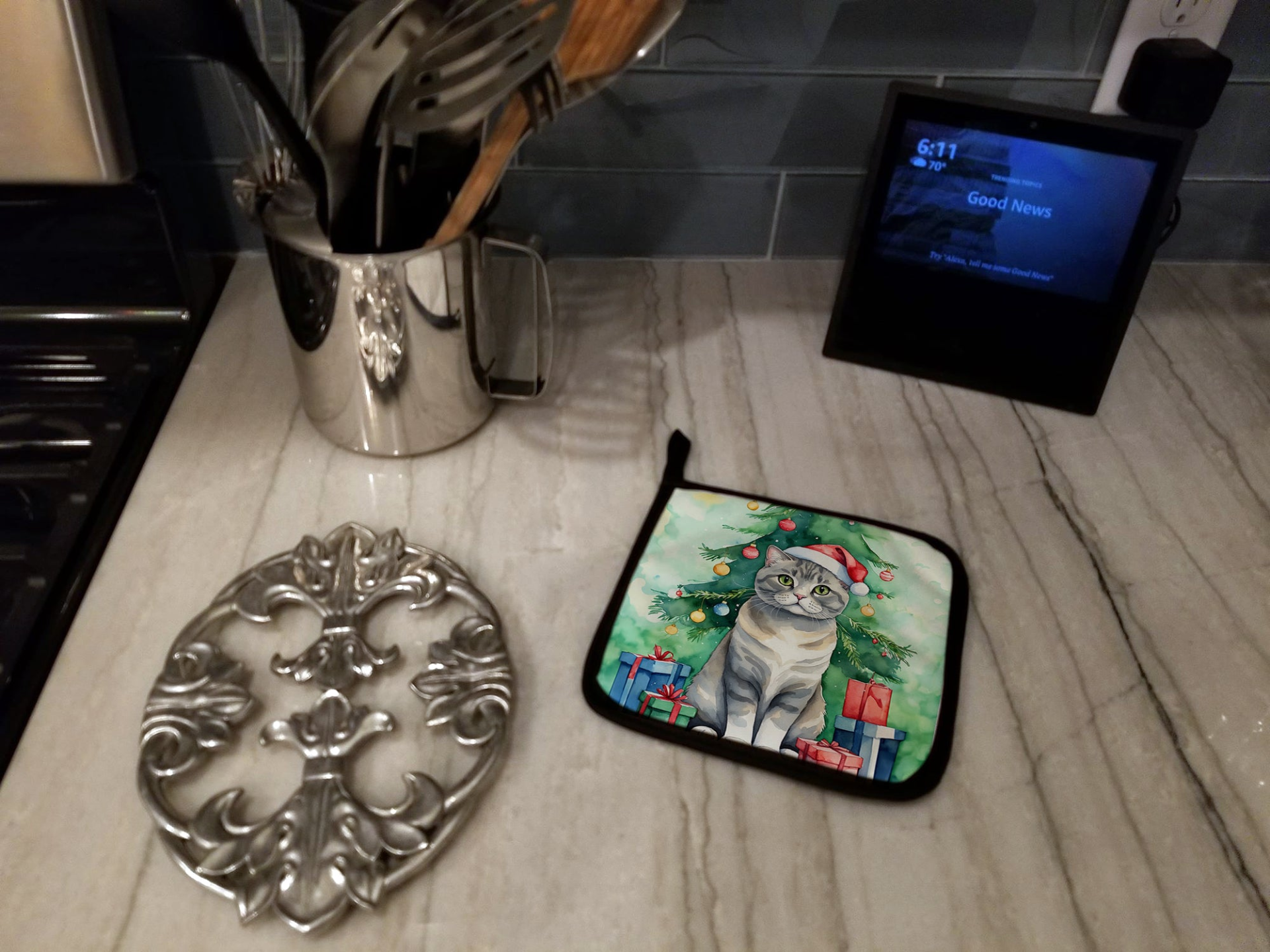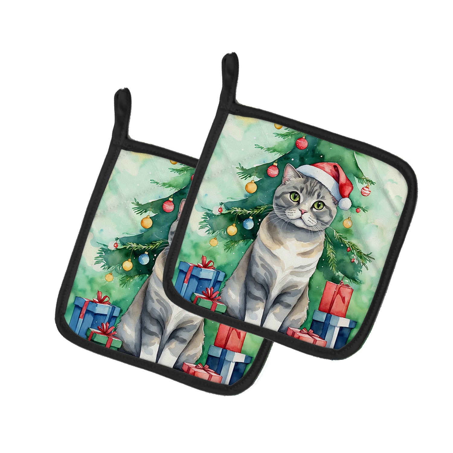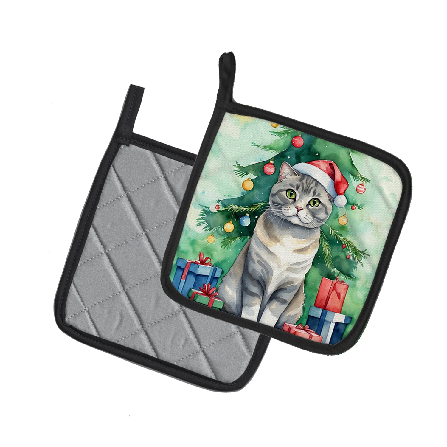 Pair of Pot Holders featuring breed specific Scottish Fold artwork. Celebrate Christmas with this Christmas Pair of Pot Holders. A Pair of Pot Holders to match your kitchen decor. Made in the USA these are thick and functional. Full color artwork decorates the front polyester fabric of the hot pad and accented by a black trim. Use these at as a trivet for your Thanksgiving or Christmas tablescape. Filled with insulated fabric and quilted for durability. These colorful pot holders will make a great gift for your favorite home cook or executive chef. Each pot holder measures approximately 7 1/2 inches by 7 1/2 inches. A hanging tab is included.