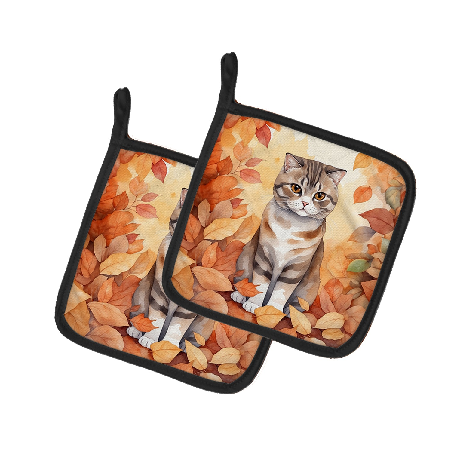 Pair of Pot Holders featuring breed specific Scottish Fold artwork. A Pair of Pot Holders to match your kitchen decor. Made in the USA these are thick and functional. Full color artwork decorates the front polyester fabric of the hot pad and accented by a black trim. Use these at as a trivet for your Thanksgiving or Christmas tablescape. Filled with insulated fabric and quilted for durability. These colorful pot holders will make a great gift for your favorite home cook or executive chef. Each pot holder measures approximately 7 1/2 inches by 7 1/2 inches. A hanging tab is included.