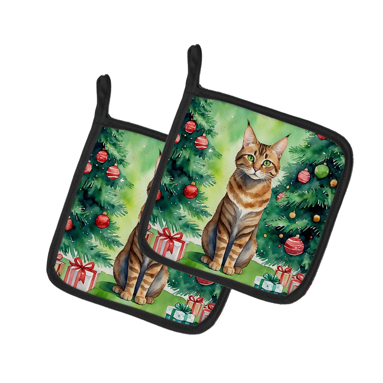 Sokoke Cat By the Christmas Tree Pair of Pot Holders