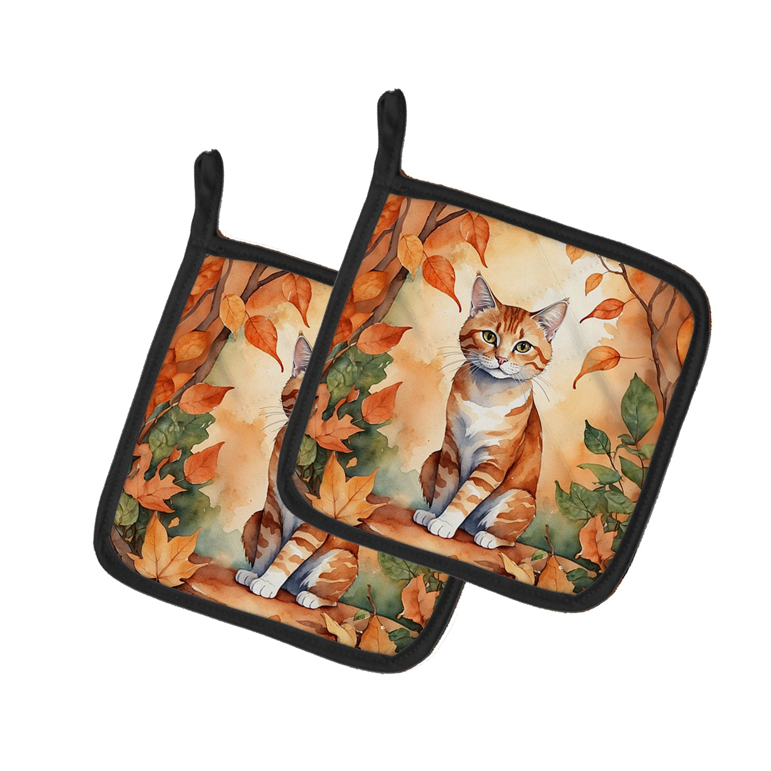 Suphalak Cat in Fall Leaves Pair of Pot Holders