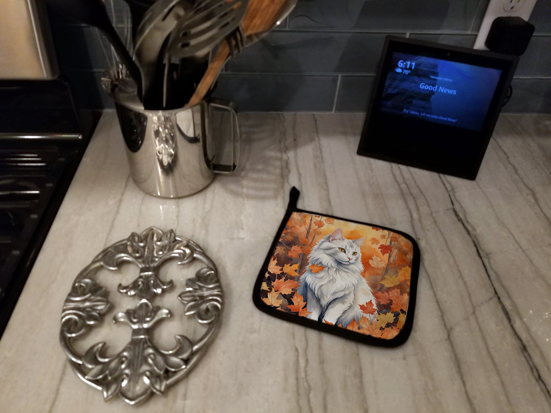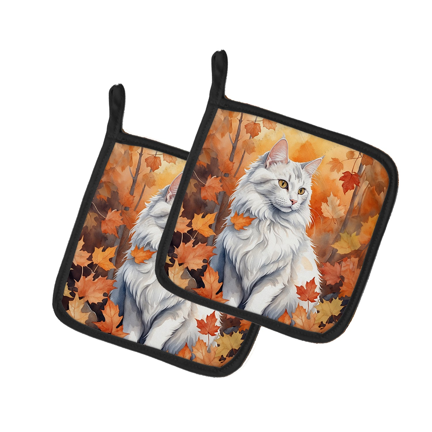 Pair of Pot Holders featuring breed specific Turkish Angora Cat artwork. A Pair of Pot Holders to match your kitchen decor. Made in the USA these are thick and functional. Full color artwork decorates the front polyester fabric of the hot pad and accented by a black trim. Use these at as a trivet for your Thanksgiving or Christmas tablescape. Filled with insulated fabric and quilted for durability. These colorful pot holders will make a great gift for your favorite home cook or executive chef. Each pot holder measures approximately 7 1/2 inches by 7 1/2 inches. A hanging tab is included.