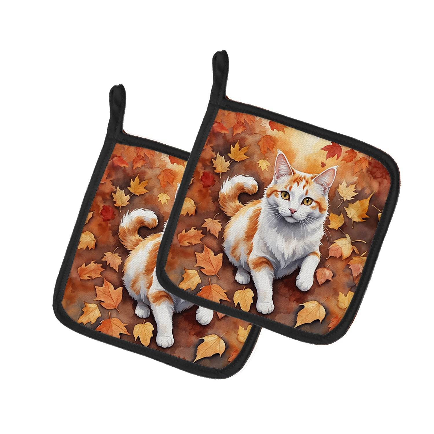 Pair of Pot Holders featuring breed specific Turkish Van artwork. A Pair of Pot Holders to match your kitchen decor. Made in the USA these are thick and functional. Full color artwork decorates the front polyester fabric of the hot pad and accented by a black trim. Use these at as a trivet for your Thanksgiving or Christmas tablescape. Filled with insulated fabric and quilted for durability. These colorful pot holders will make a great gift for your favorite home cook or executive chef. Each pot holder measures approximately 7 1/2 inches by 7 1/2 inches. A hanging tab is included.