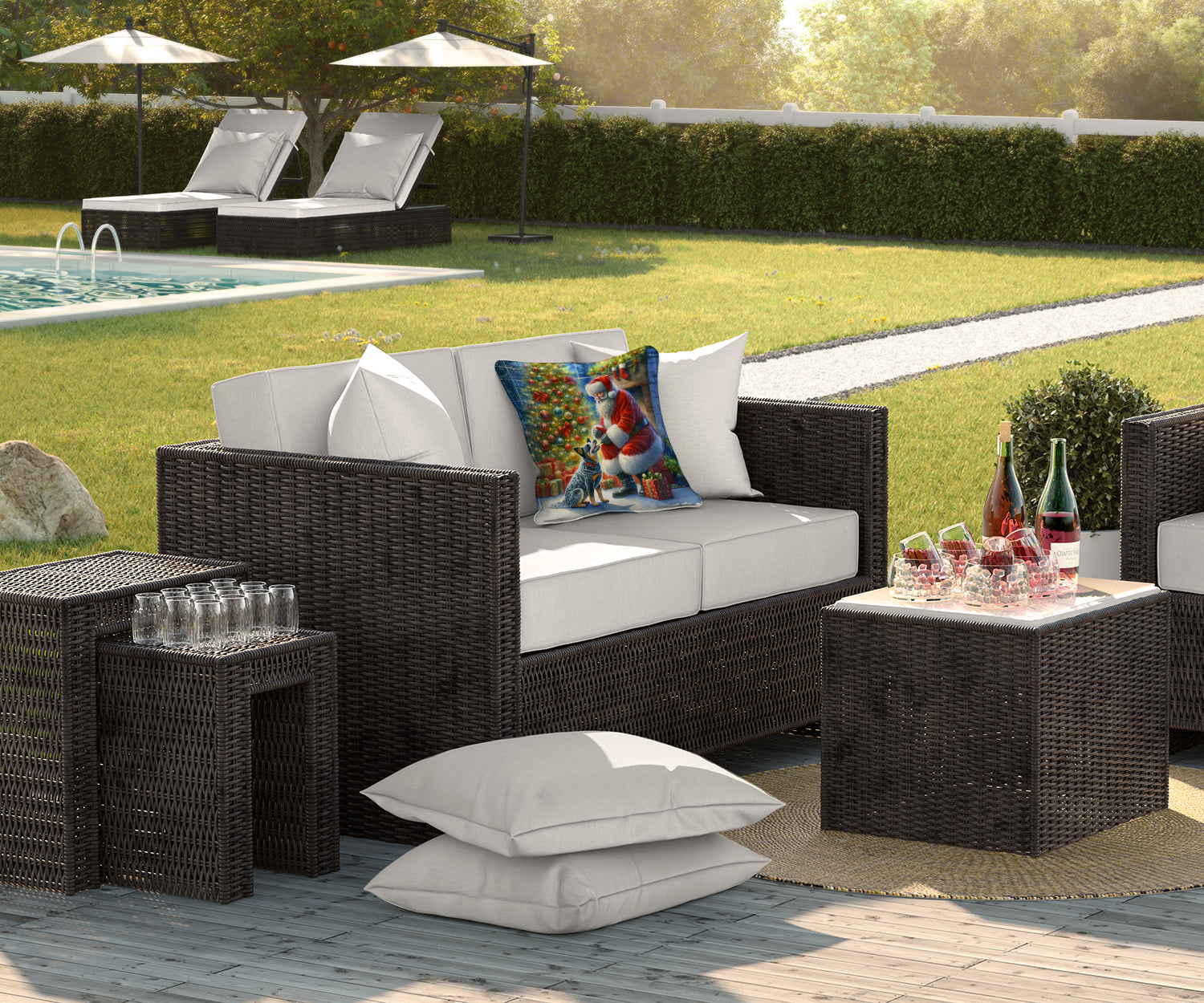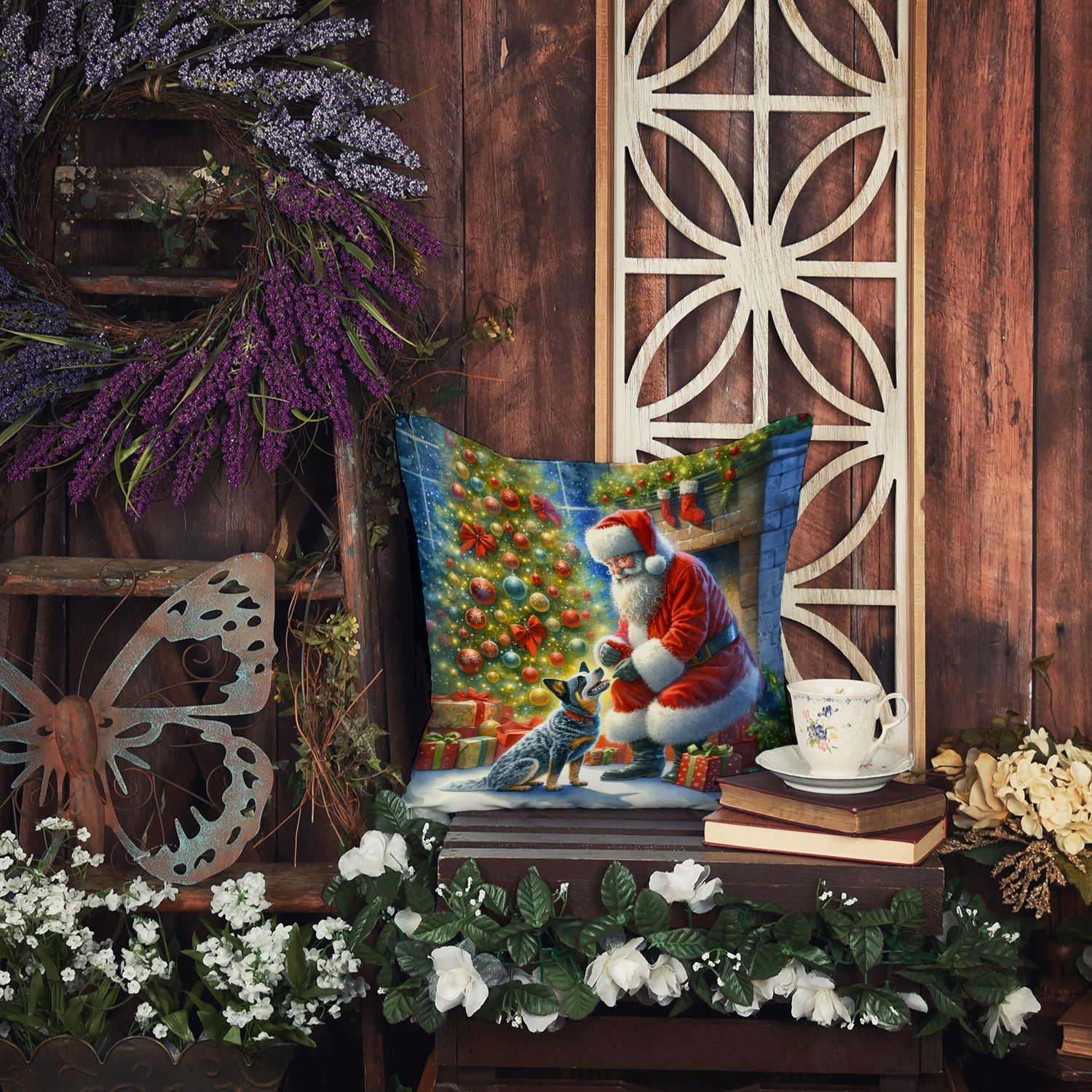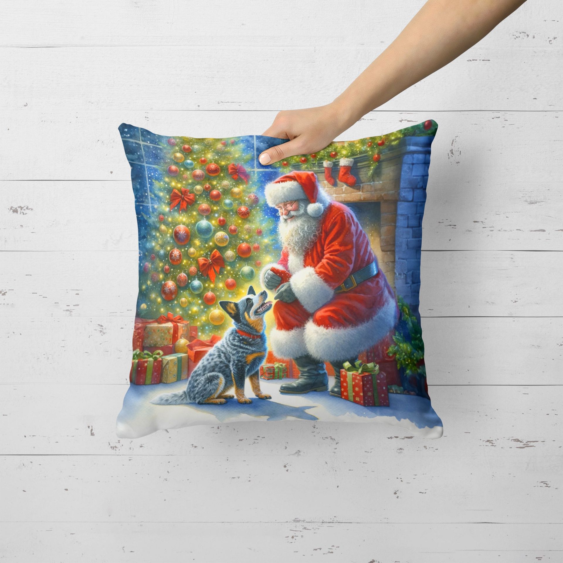Throw Pillow featuring breed specific Australian Cattle Dog artwork. Celebrate Christmas with this Christmas Pillow. Revitalize your outdoor or indoor living space with Caroline's Treasures 18x18 Fabric Decorative Pillow. With a generously sized dimension of approximately 18 inches by 18 inches, this pillow makes a comfortable and aesthetic addition to any seating area. Made from a unique, water-resistant material developed by Caroline's Treasures, the pillow sham is 100% polyester fabric that's durable and ready to weather any condition. Its vibrant, full-color artwork will not fade over time as it is dyed with color-fast dyes. Whether you place it on your patio furniture, porch, veranda, or indoor couch, its soft canvas fabric ensures a cozy experience. The pillow is handcrafted in the United States, featuring a sham created from three pieces of fabric and a polyester insert for enduring shape and overstuffed comfort. Despite being robustly built to endure the outdoors, it is as soft and snug as your favorite indoor cushions. Please note, as all our pillows are handmade, sizes may vary slightly, adding to the charm of this unique decorative item.