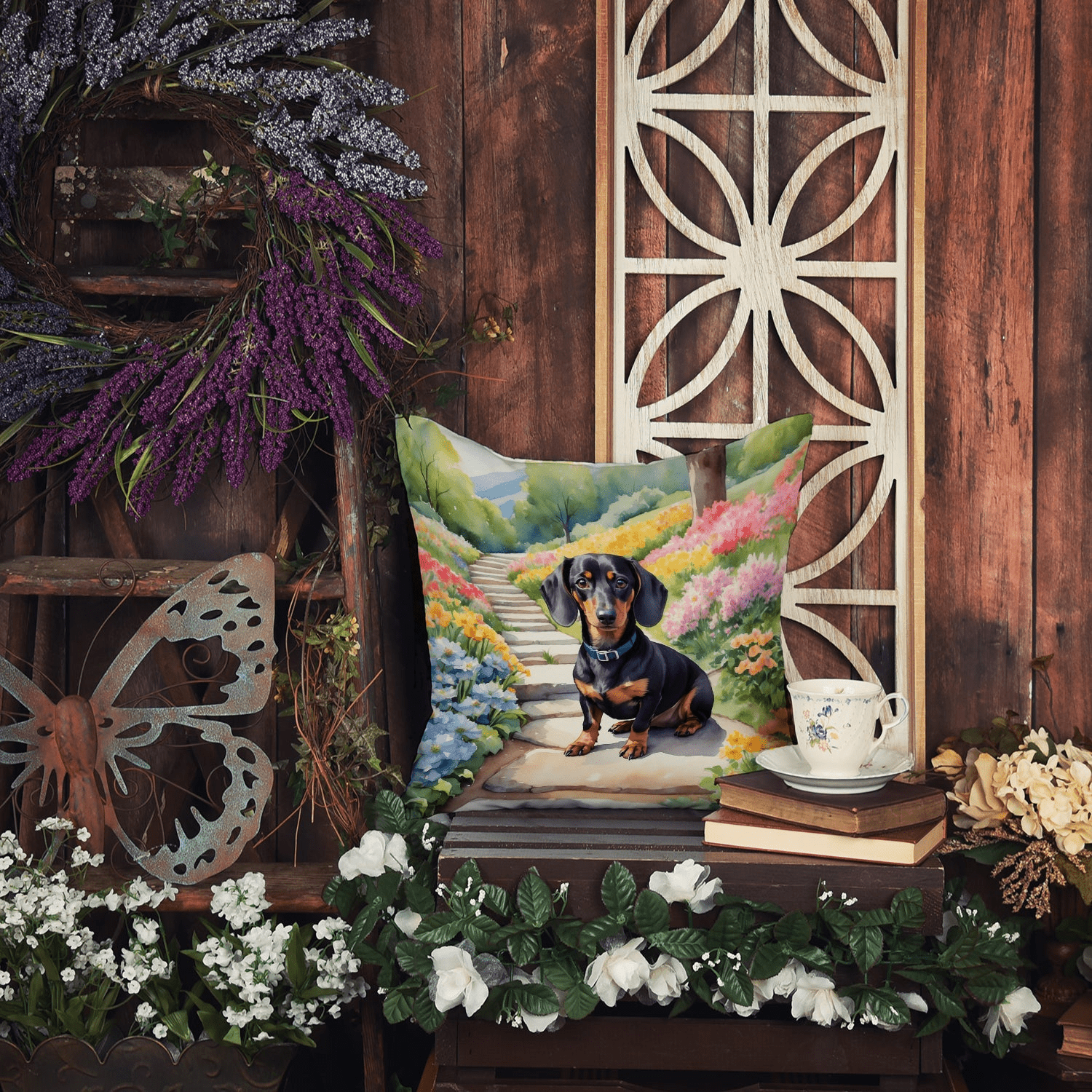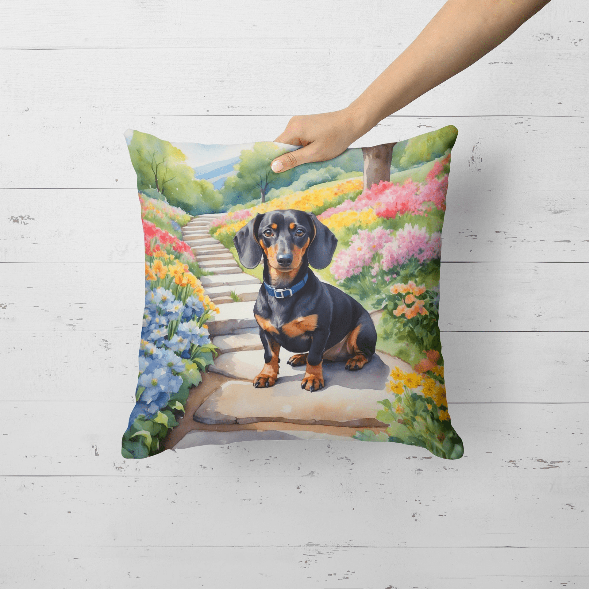 Throw Pillow featuring breed specific Dachshund artwork. Revitalize your outdoor or indoor living space with Caroline's Treasures 18x18 Fabric Decorative Pillow. With a generously sized dimension of approximately 18 inches by 18 inches, this pillow makes a comfortable and aesthetic addition to any seating area. Made from a unique, water-resistant material developed by Caroline's Treasures, the pillow sham is 100% polyester fabric that's durable and ready to weather any condition. Its vibrant, full-color artwork will not fade over time as it is dyed with color-fast dyes. Whether you place it on your patio furniture, porch, veranda, or indoor couch, its soft canvas fabric ensures a cozy experience. The pillow is handcrafted in the United States, featuring a sham created from three pieces of fabric and a polyester insert for enduring shape and overstuffed comfort. Despite being robustly built to endure the outdoors, it is as soft and snug as your favorite indoor cushions. Please note, as all our pillows are handmade, sizes may vary slightly, adding to the charm of this unique decorative item.