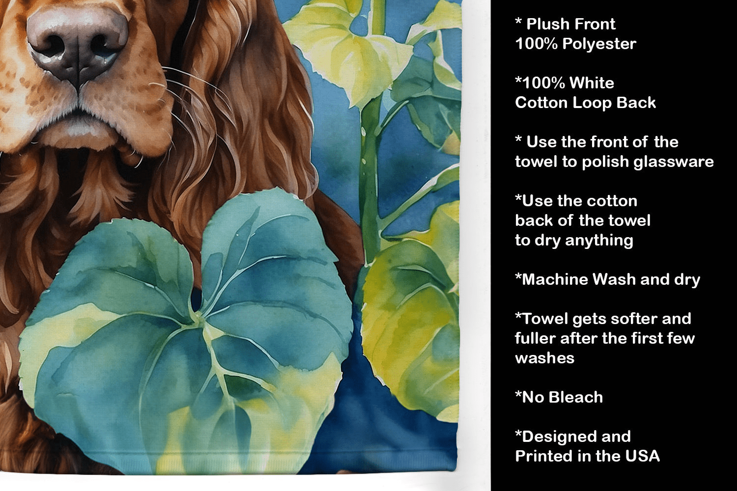 - Artwork: Breed-specific English Cocker Spaniel in sunflowers, directly dyed into fabric
