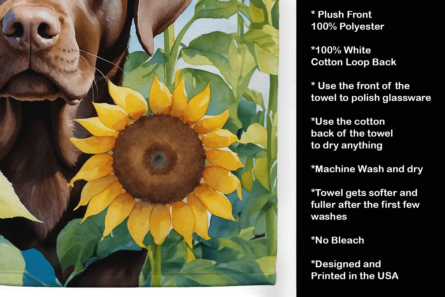 Wrap your kitchen in a touch of warm, sunlit charm with this plush velour kitchen towel. The Labrador Retriever in Sunflowers artwork exudes cheerful elegance, blending enduring practicality with luxurious softness for everyday use. The front’s minky plush surface is color-rich and durable, while the back cotton terry loop soaks up spills and dries hands with ease. Perfect for daily routines, it elevates tasks with style and a sense of pampered comfort.
