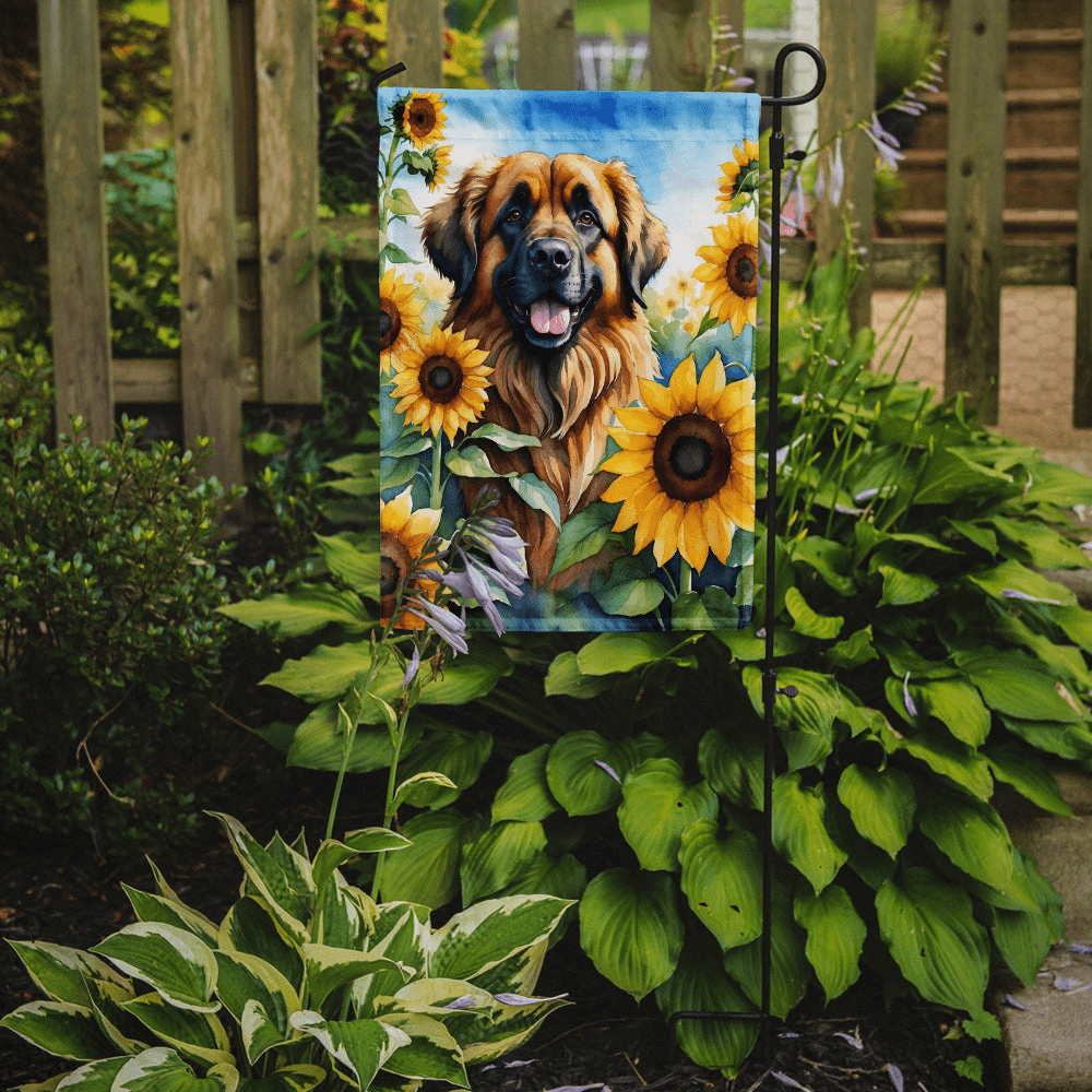 Elevate your outdoor space with a touch of sunlit charm. This garden flag features a regal Leonberger amid bright sunflowers, designed to bring warmth and personality to your garden, patio, or yard. Proudly made in the USA and crafted to withstand seasonal weather, it remains vibrant from every angle, so your space feels inviting on every visit.