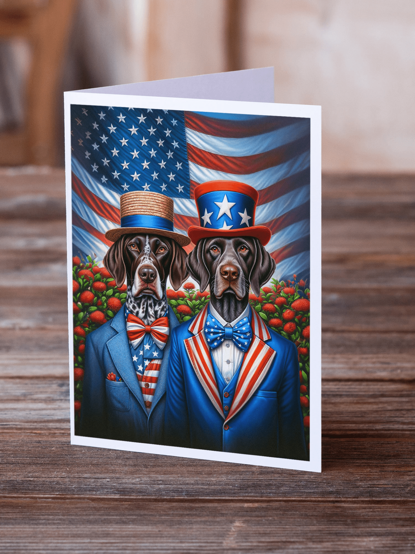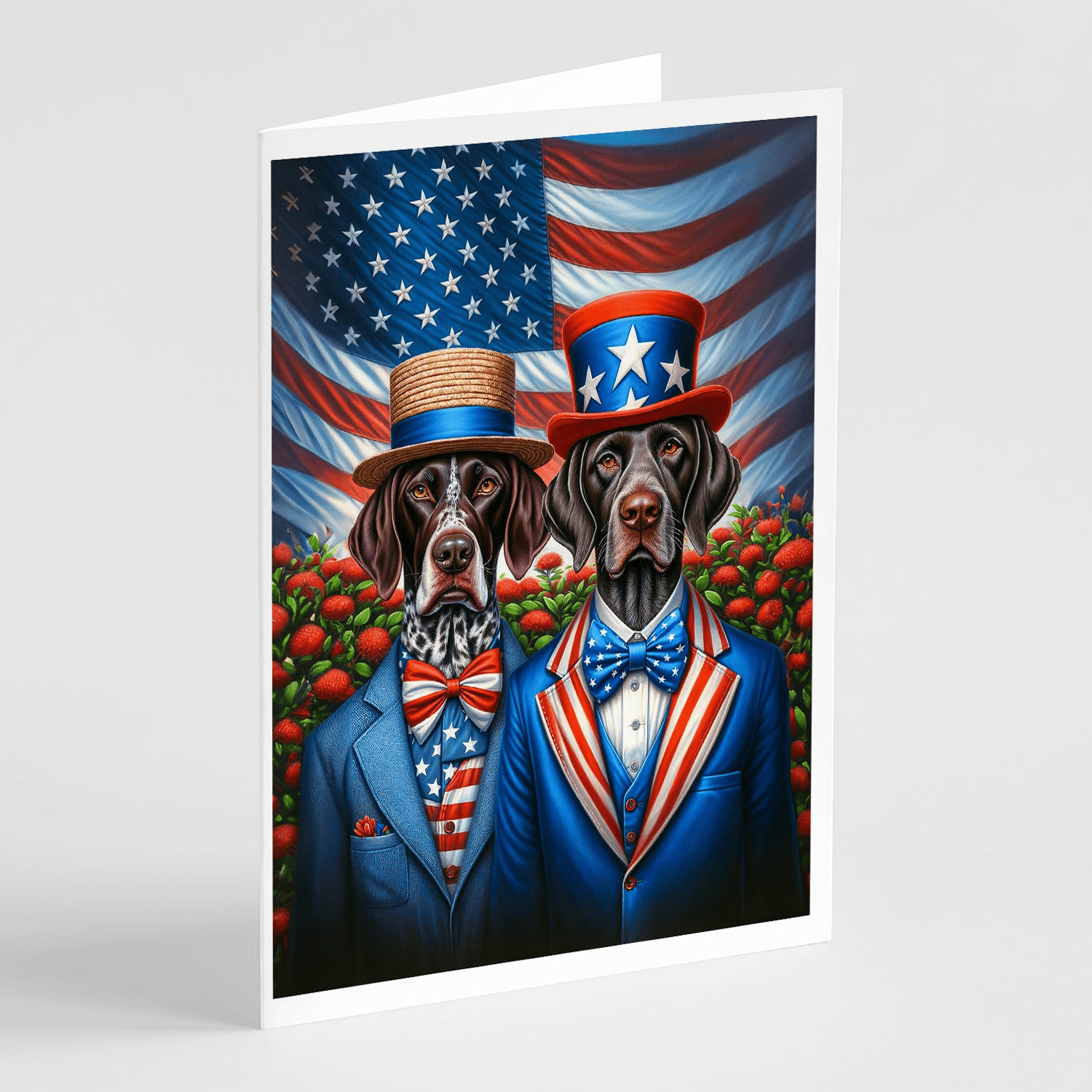 Greeting Cards Pack of 8 featuring breed specific German Shorthaired Pointer artwork. Celebrate special moments with Caroline's Treasures Printed Greeting Card Pack. This pack includes eight beautifully folded 5x7 cards, accompanied by eight matching white envelopes. With blank interiors, these cards provide ample space for your personalized messages and heartfelt holiday greetings. Each card features captivating full-color artwork, meticulously printed in our facility on high-quality 80 lb cover stock or 216 GSM. The super smooth finish of the white cards enhances the visual impact of the artwork, creating a truly stunning presentation. Designed by our talented in-house artists or licensed artists, the artwork on these cards showcases their creativity and attention to detail. From vibrant illustrations to captivating designs, each card tells its own unique story. Whether it's for birthdays, anniversaries, holidays, or any special occasion, Caroline's Treasures Greeting Card Pack is the perfect way to convey your heartfelt sentiments. Share joy, love, and warm wishes with these exquisite cards and make every moment unforgettable.