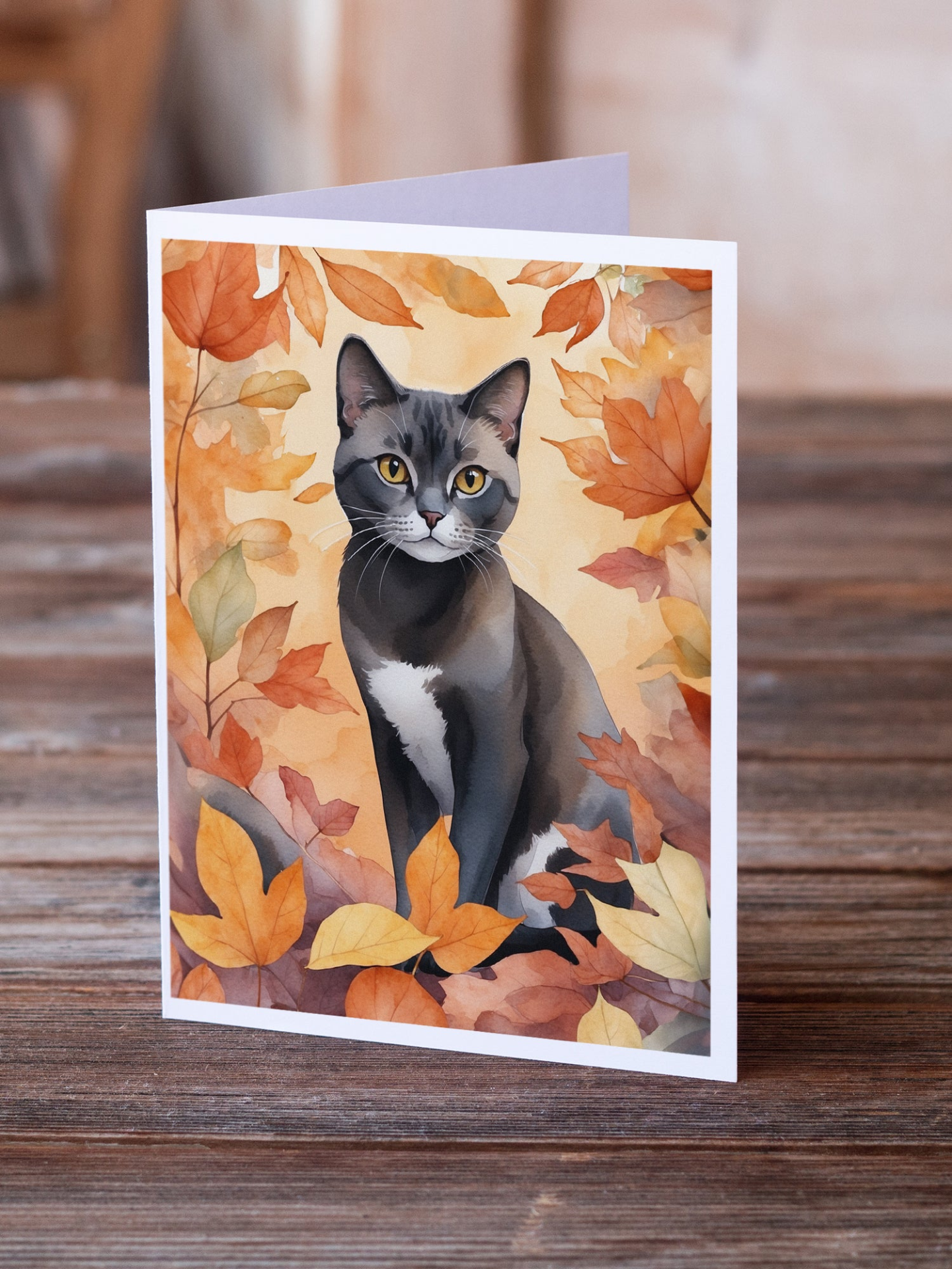 Asian Cat in Fall Leaves Greeting Cards Pack of 8