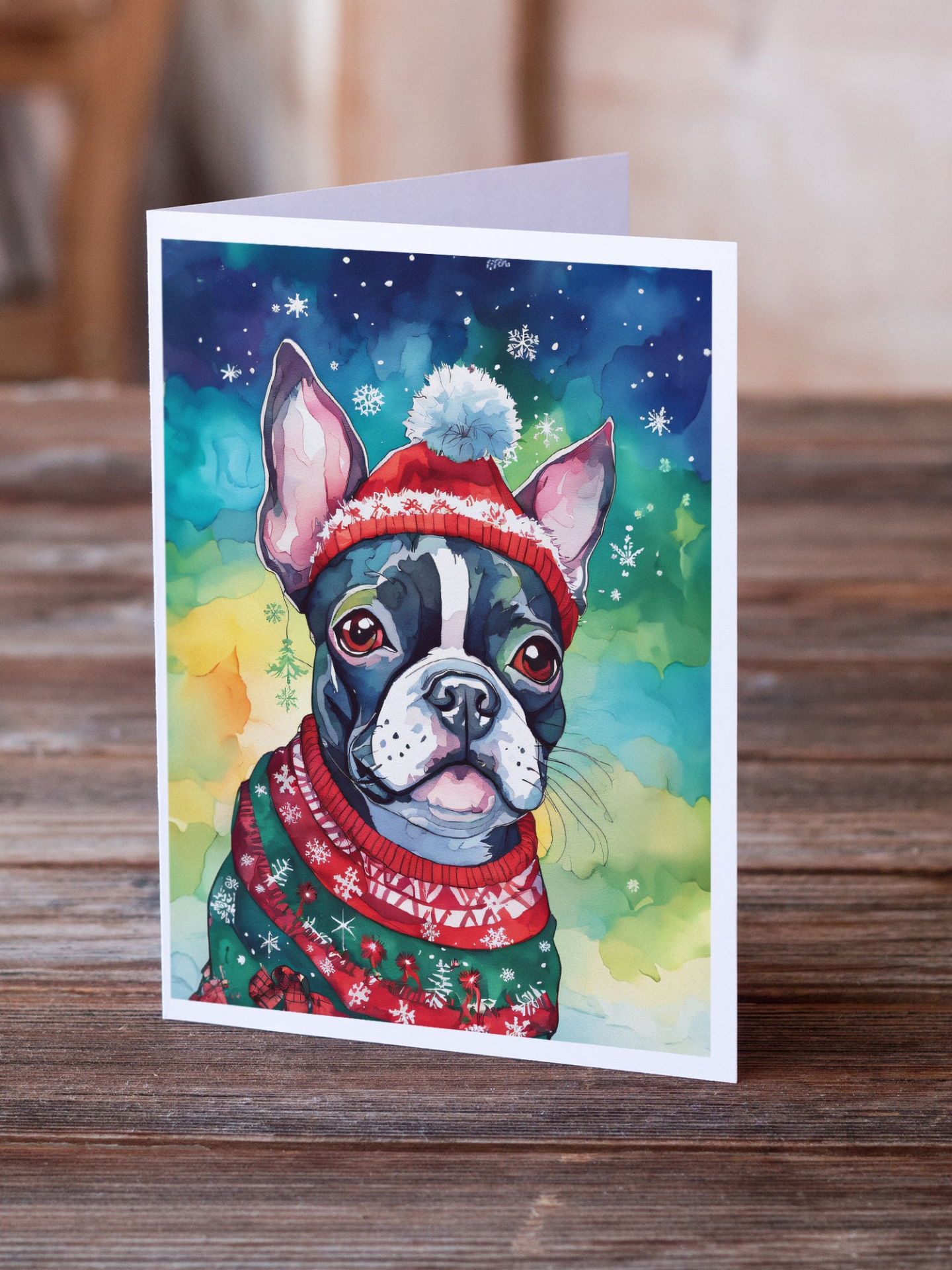 Greeting Cards Pack of 8 featuring breed specific Boston Terrier artwork. Celebrate Christmas with this Christmas . Celebrate special moments with Caroline's Treasures Printed Greeting Card Pack. This pack includes eight beautifully folded 5x7 cards, accompanied by eight matching white envelopes. With blank interiors, these cards provide ample space for your personalized messages and heartfelt holiday greetings. Each card features captivating full-color artwork, meticulously printed in our facility on high-quality 80 lb cover stock or 216 GSM. The super smooth finish of the white cards enhances the visual impact of the artwork, creating a truly stunning presentation. Designed by our talented in-house artists or licensed artists, the artwork on these cards showcases their creativity and attention to detail. From vibrant illustrations to captivating designs, each card tells its own unique story. Whether it's for birthdays, anniversaries, holidays, or any special occasion, Caroline's Treasures Greeting Card Pack is the perfect way to convey your heartfelt sentiments. Share joy, love, and warm wishes with these exquisite cards and make every moment unforgettable.