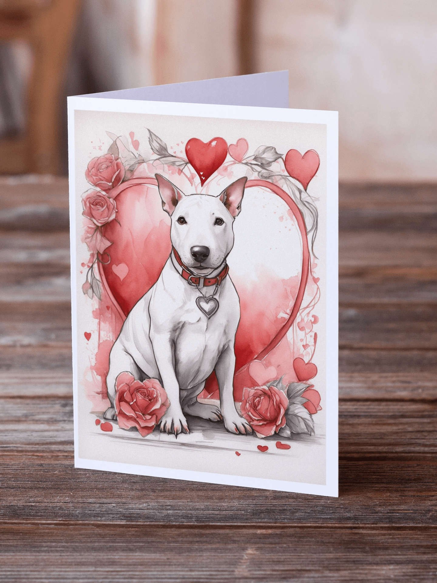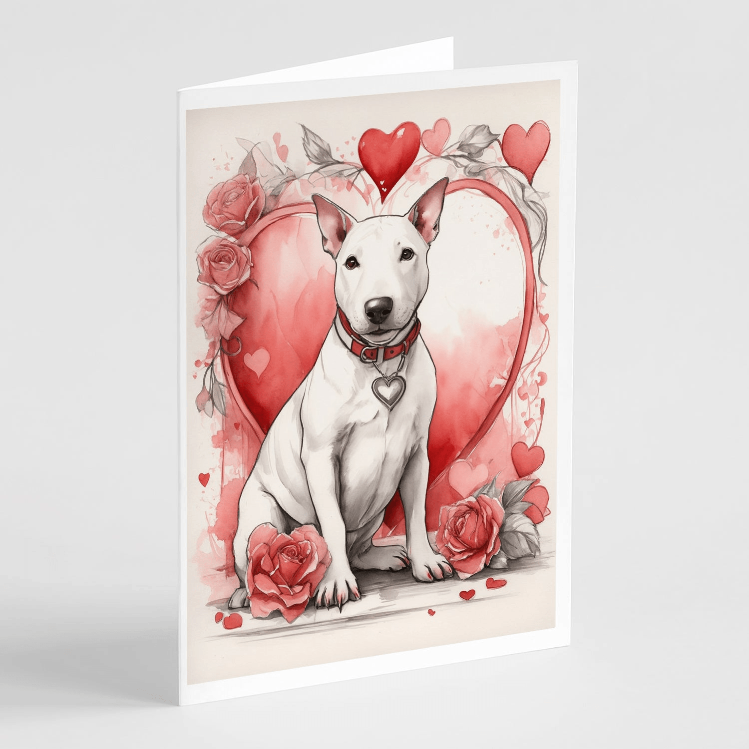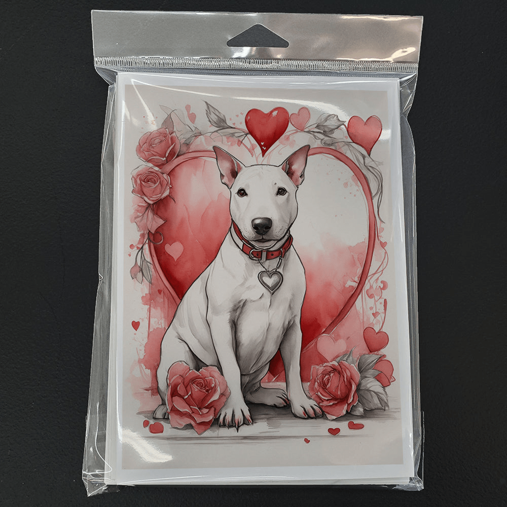 Greeting Cards Pack of 8 featuring breed specific Bull Terrier artwork. Celebrate Valentine's Day with this Valentine's Day . Celebrate special moments with Caroline's Treasures Printed Greeting Card Pack. This pack includes eight beautifully folded 5x7 cards, accompanied by eight matching white envelopes. With blank interiors, these cards provide ample space for your personalized messages and heartfelt holiday greetings. Each card features captivating full-color artwork, meticulously printed in our facility on high-quality 80 lb cover stock or 216 GSM. The super smooth finish of the white cards enhances the visual impact of the artwork, creating a truly stunning presentation. Designed by our talented in-house artists or licensed artists, the artwork on these cards showcases their creativity and attention to detail. From vibrant illustrations to captivating designs, each card tells its own unique story. Whether it's for birthdays, anniversaries, holidays, or any special occasion, Caroline's Treasures Greeting Card Pack is the perfect way to convey your heartfelt sentiments. Share joy, love, and warm wishes with these exquisite cards and make every moment unforgettable.