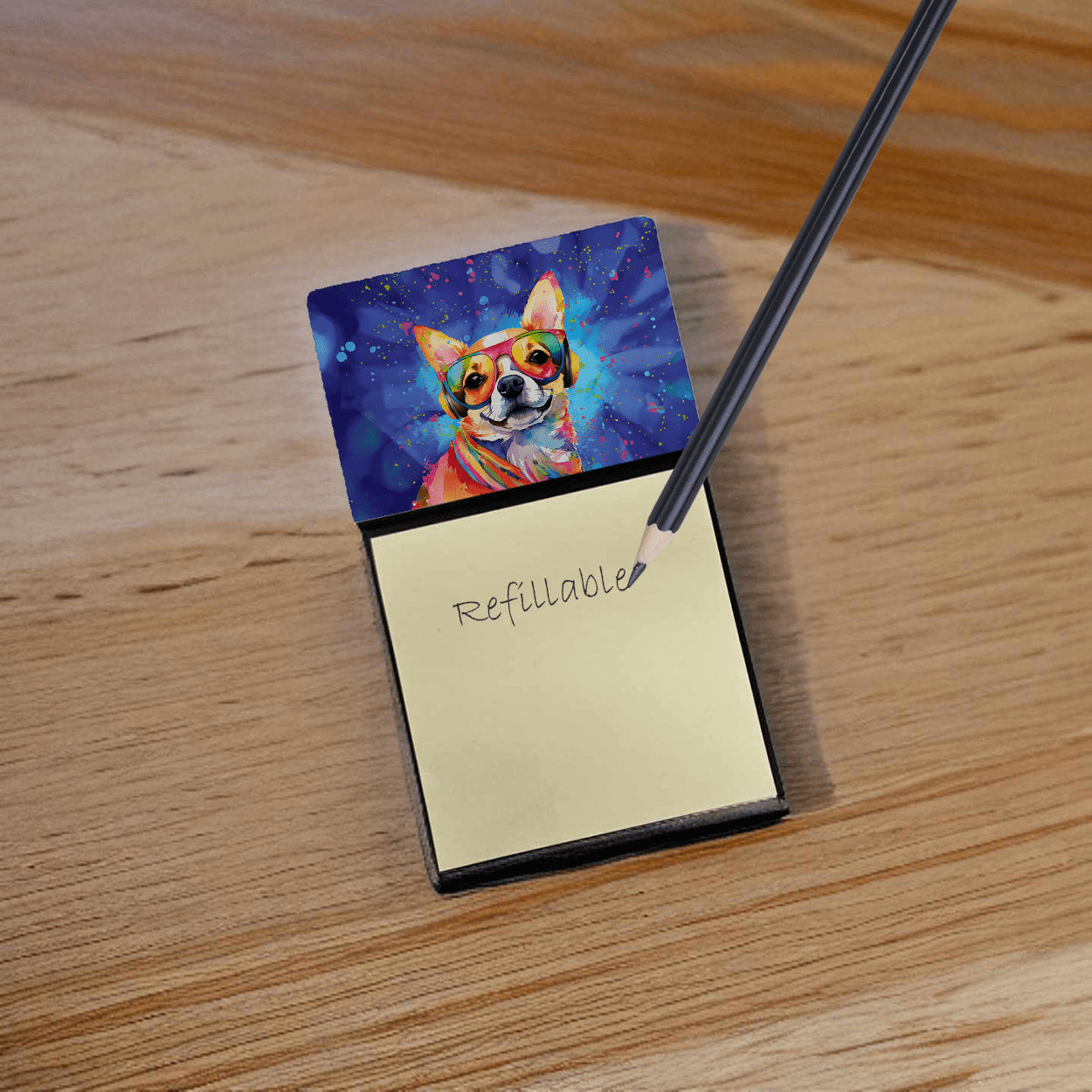 Sticky Note Holder featuring breed specific Chihuahua artwork. Add a touch of creativity and flair to your desk with the Decorative Sticky Note Holder from Caroline's Treasures. This uniquely designed sticky note dispenser will not only keep your notes in one place but also add an artistic element to your workspace. The top of the holder features beautiful artwork that is sure to catch the eye. Crafted for convenience, this sticky note holder comes with a small pad of 3-inch x 3-inch sticky notes at the bottom. The holder is designed for easy refilling; simply remove the last sheet of a new sticky note pad and stick it onto the board. This feature ensures you will always have sticky notes at your disposal. This Sticky Note Holder makes a perfect gift. Be it for your colleagues at work, your Facebook friends, or even your dog groomer or hairdresser, this versatile product fits the bill. You can use it for making grocery lists, leaving notes for loved ones, or for jotting down important reminders. The bottom board is rigid and can be magnetized by adding a business card size magnet to the back (sold separately). This makes it even more versatile, allowing you to place it on a refrigerator or any other magnetic surface. With this Sticky Note Holder, you're not only organizing your notes, but also personalizing your space.