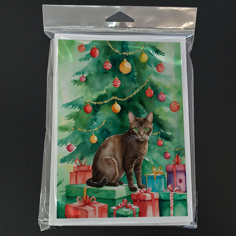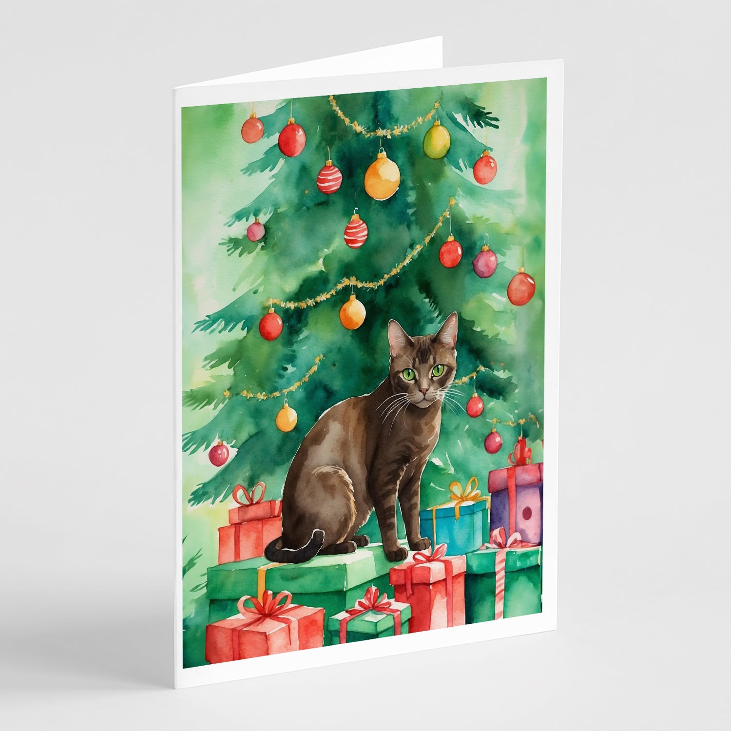 Havana Brown Cat By the Christmas Tree Greeting Cards Pack of 8