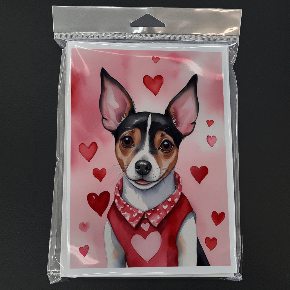 Greeting Cards Pack of 8 featuring breed specific Rat Terrier artwork. Celebrate Valentine's Day with this Valentine's Day . Celebrate special moments with Caroline's Treasures Printed Greeting Card Pack. This pack includes eight beautifully folded 5x7 cards, accompanied by eight matching white envelopes. With blank interiors, these cards provide ample space for your personalized messages and heartfelt holiday greetings. Each card features captivating full-color artwork, meticulously printed in our facility on high-quality 80 lb cover stock or 216 GSM. The super smooth finish of the white cards enhances the visual impact of the artwork, creating a truly stunning presentation. Designed by our talented in-house artists or licensed artists, the artwork on these cards showcases their creativity and attention to detail. From vibrant illustrations to captivating designs, each card tells its own unique story. Whether it's for birthdays, anniversaries, holidays, or any special occasion, Caroline's Treasures Greeting Card Pack is the perfect way to convey your heartfelt sentiments. Share joy, love, and warm wishes with these exquisite cards and make every moment unforgettable.