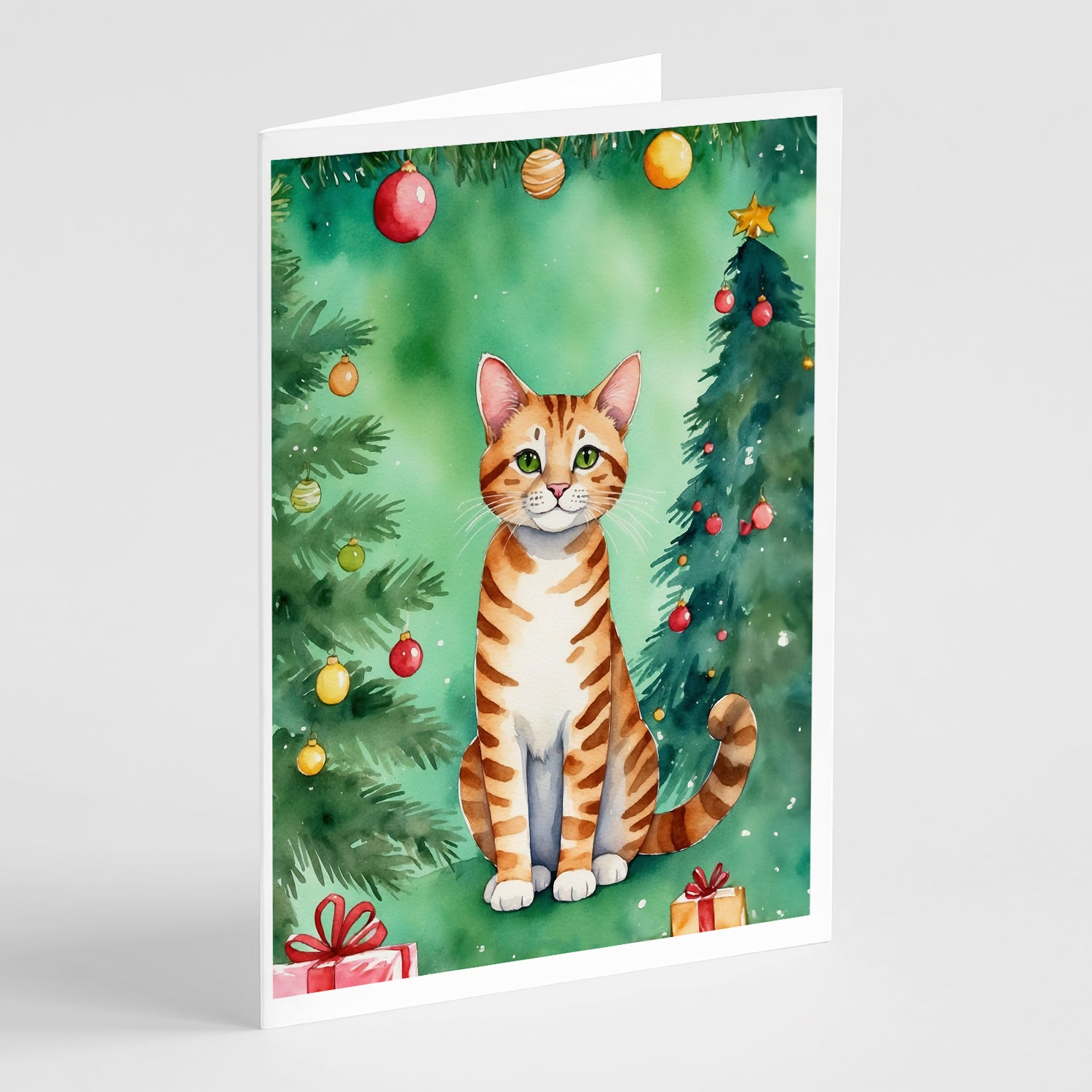 Safari Cat By the Christmas Tree Greeting Cards Pack of 8