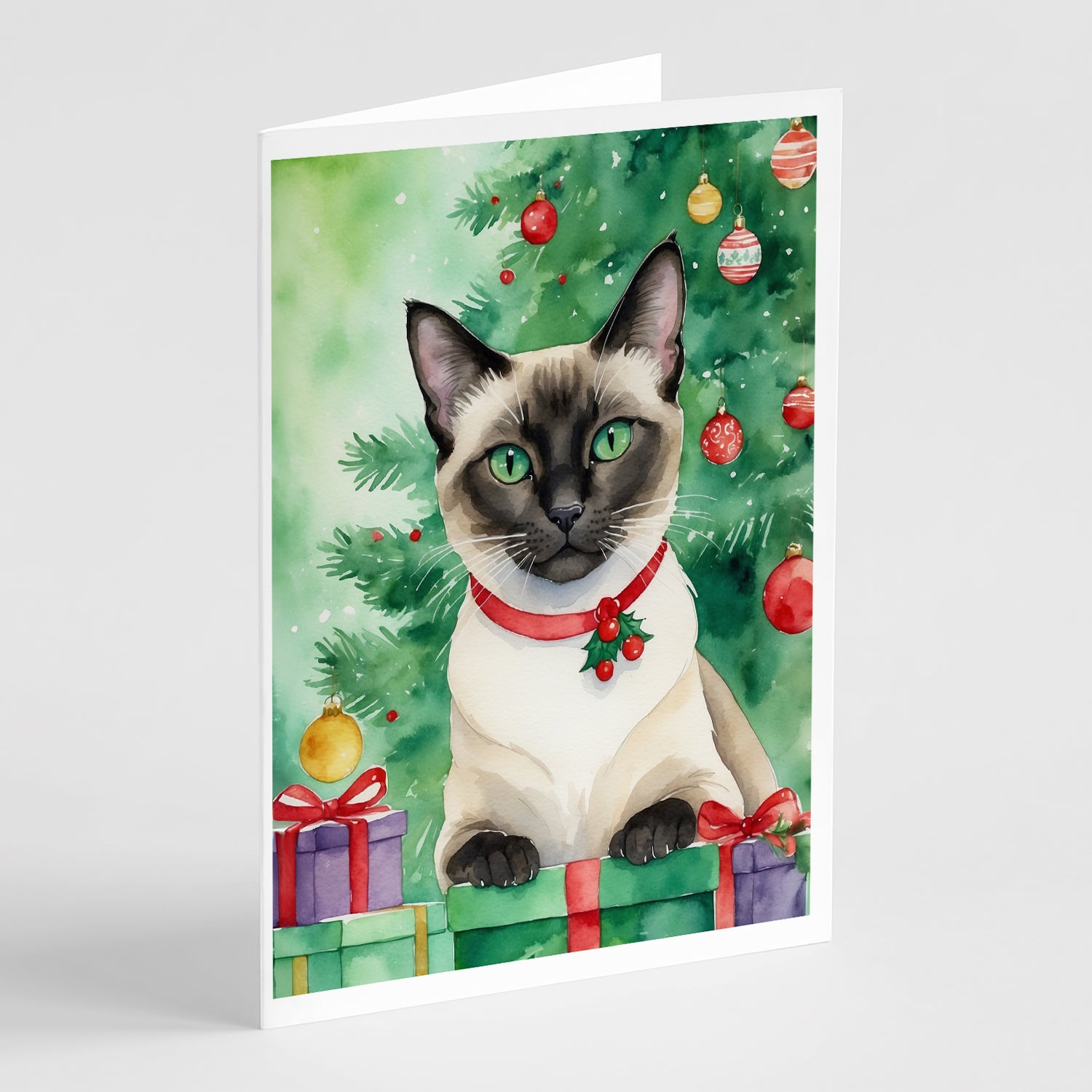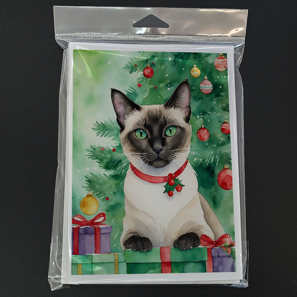 Siamese Cat By the Christmas Tree Greeting Cards Pack of 8