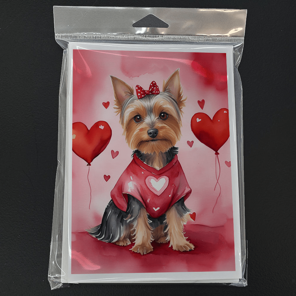 Greeting Cards Pack of 8 featuring breed specific Silky Terrier artwork. Celebrate Valentine's Day with this Valentine's Day . Celebrate special moments with Caroline's Treasures Printed Greeting Card Pack. This pack includes eight beautifully folded 5x7 cards, accompanied by eight matching white envelopes. With blank interiors, these cards provide ample space for your personalized messages and heartfelt holiday greetings. Each card features captivating full-color artwork, meticulously printed in our facility on high-quality 80 lb cover stock or 216 GSM. The super smooth finish of the white cards enhances the visual impact of the artwork, creating a truly stunning presentation. Designed by our talented in-house artists or licensed artists, the artwork on these cards showcases their creativity and attention to detail. From vibrant illustrations to captivating designs, each card tells its own unique story. Whether it's for birthdays, anniversaries, holidays, or any special occasion, Caroline's Treasures Greeting Card Pack is the perfect way to convey your heartfelt sentiments. Share joy, love, and warm wishes with these exquisite cards and make every moment unforgettable.
