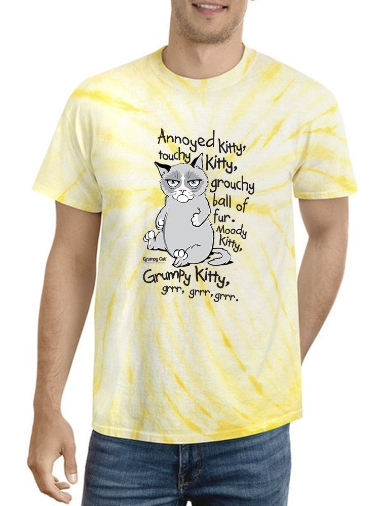 Annoed Kitty. Grumpy Cat Tie-Dye Cyclone - - M / Male / Pale Yellow is backordered and will ship as soon as it is back in stock.