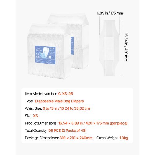 Type: Disposable Male Dog Diapers,Waist Size: 6 to 13 in / 15.24 to33.02 cm,Item Model Number: G-XS-96,Wrap Size: XS,ProductDimensions: 16.54 x 6.89 in / 420 x 175 mm (per piece),Net Weight:3.73 lbs / 1.69 kg,Total Quantity: 96 PCS (2 Packs of 48)